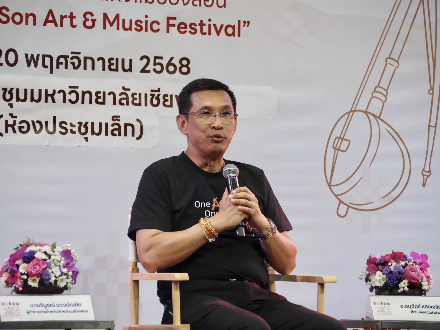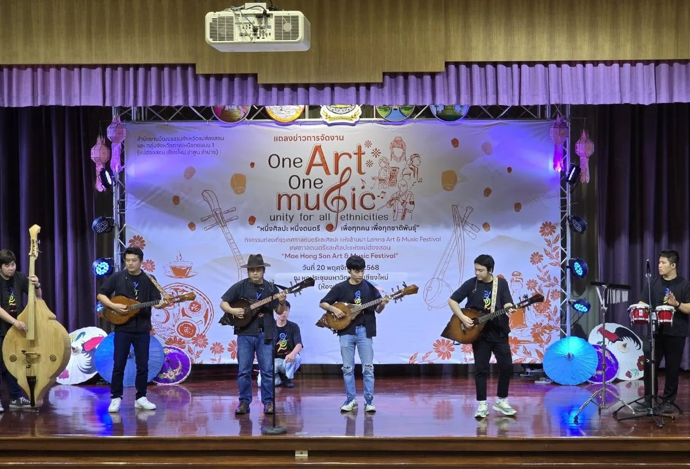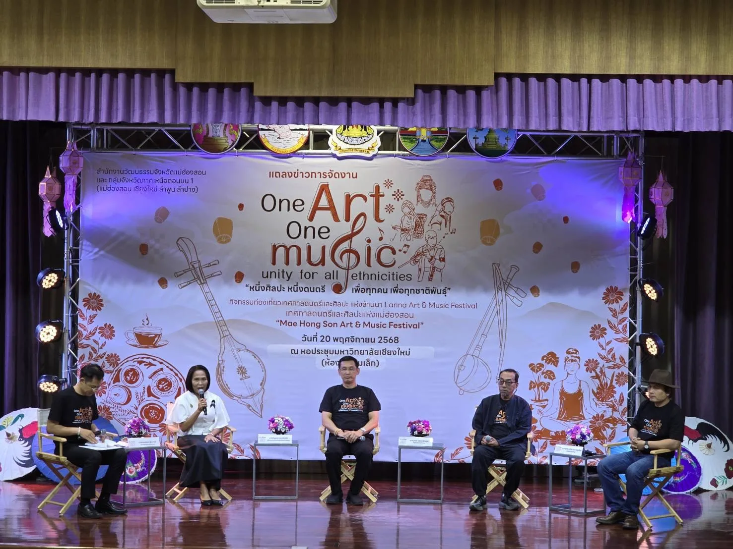 วันที่ 20 พฤศจิกายน 2568 ที่ ห้องประชุมเล็ก หอประชุมมหาวิทยาลัยเชียงใหม่ จังหวัดเชียงใหม่ นายวิบูรณ์ แววบัณฑิต ผู้ว่าราชการจังหวัดแม่ฮ่องสอน พร้อมด้วย นางกรวรรณ สุ่มมาตย์ วัฒนธรรมจังหวัดเชียงใหม่ อาจารย์ภานุทัต อภิชนาธง (ครูแอ๊ด เดอะสะล้อ) ศิลปินจังหวัดลำพูน และนายอนุวัตร์ แสงเจริญกูล ศิลปินจังหวัดลำปาง ร่วมแถลงข่าวเตรียมการจัดงาน “One art, One music – Unity for all Ethnicities หนึ่งศิลปะ หนึ่งดนตรี เพื่อทุกคน เพื่อทุกชาติพันธุ์” จัดโดยสำนักงานวัฒธรรมจังหวัดแม่ฮ่องสอน ร่วมกับ กลุ่มจังหวัดภาคเหนือตอนบน 1 (แม่ฮ่องสอน เชียงใหม่ ลำพูน ลำปาง) งานที่รวบรวมงานศิลปะและดนตรี ผสมผสานความหลากหลายทางวัฒนธรรมของภูมิภาคล้านนาตะวันตก และสะท้อนความงดงามของการอยู่ร่วมกันท่ามกลางความแตกต่างของชาติพันธุ์ กลุ่มจังหวัดภาคเหนือตอนบน 1 เพื่อส่งเสริมการใช้ทุนทางวัฒนธรรมเป็นรากฐานการขับเคลื่อนการท่องเที่ยวกลุ่มจังหวัดภาคเหนือตอนบน 1 สร้างการเชื่อมโยงการท่องเที่ยวเชิงวัฒนธรรมสร้างสรรค์สู่ท้องถิ่น ทั้งยังส่งเสริมการเพิ่มมูลค่าการตลาด มีเวทีสร้างองค์ความรู้และสร้างสรรค์ผลงานขับเคลื่อนเศรษฐกิจ และยกระดับการสร้างมูลค่าแก่สินค้าและบริการทางการท่องเที่ยวเชิงวัฒนธรรมอย่างสร้างสรรค์