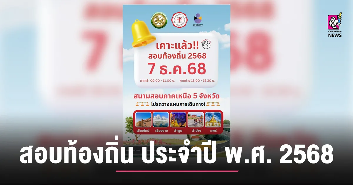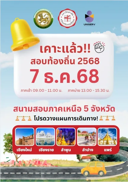 🚨การจัดสอบครั้งนี้มีผู้เข้าสอบจำนวนมากใน 5 จังหวัดภาคเหนือ ขอความร่วมมือผู้เข้าสอบและประชาชนในพื้นที่ โปรดวางแผนการเดินทางล่วงหน้า และหลีกเลี่ยงเส้นทางโดยรอบสนามสอบ เพื่อลดผลกระทบด้านการจราจรโดยเฉพาะในวันดังกล่าว