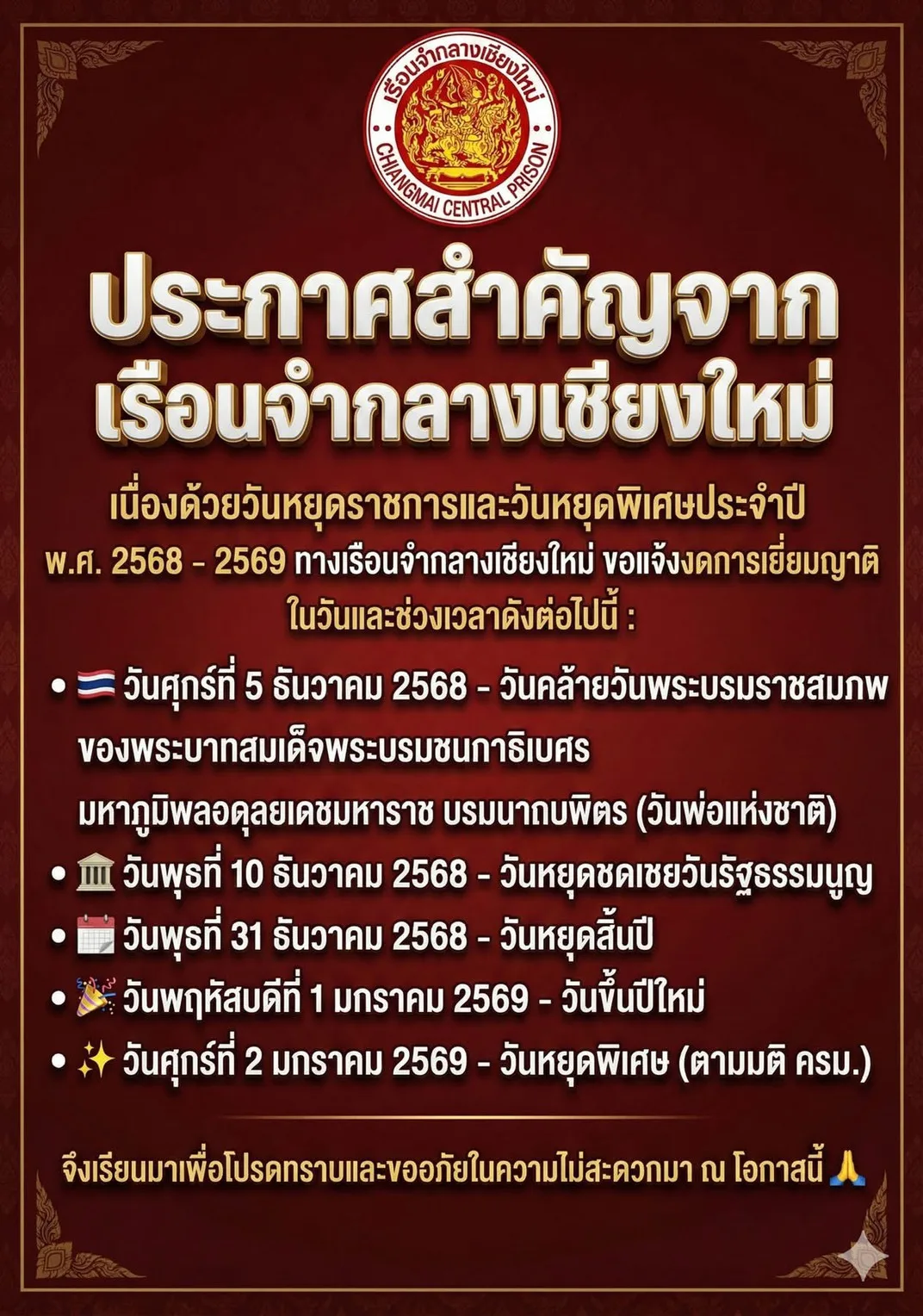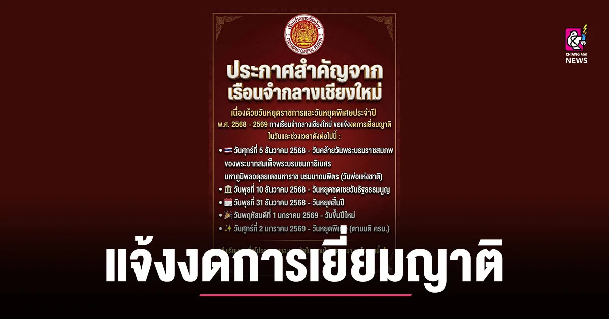 มีประกาศสำคัญจากเรือนจำกลางเชียงใหม่ เนื่องด้วยวันหยุดราชการและวันหยุดพิเศษประจำปี พ.ศ. 2568 – 2569 ทางเรือนจำกลางเชียงใหม่ ขอแจ้งงดการเยี่ยมญาติ ในวันและช่วงเวลาดังต่อไปนี้: