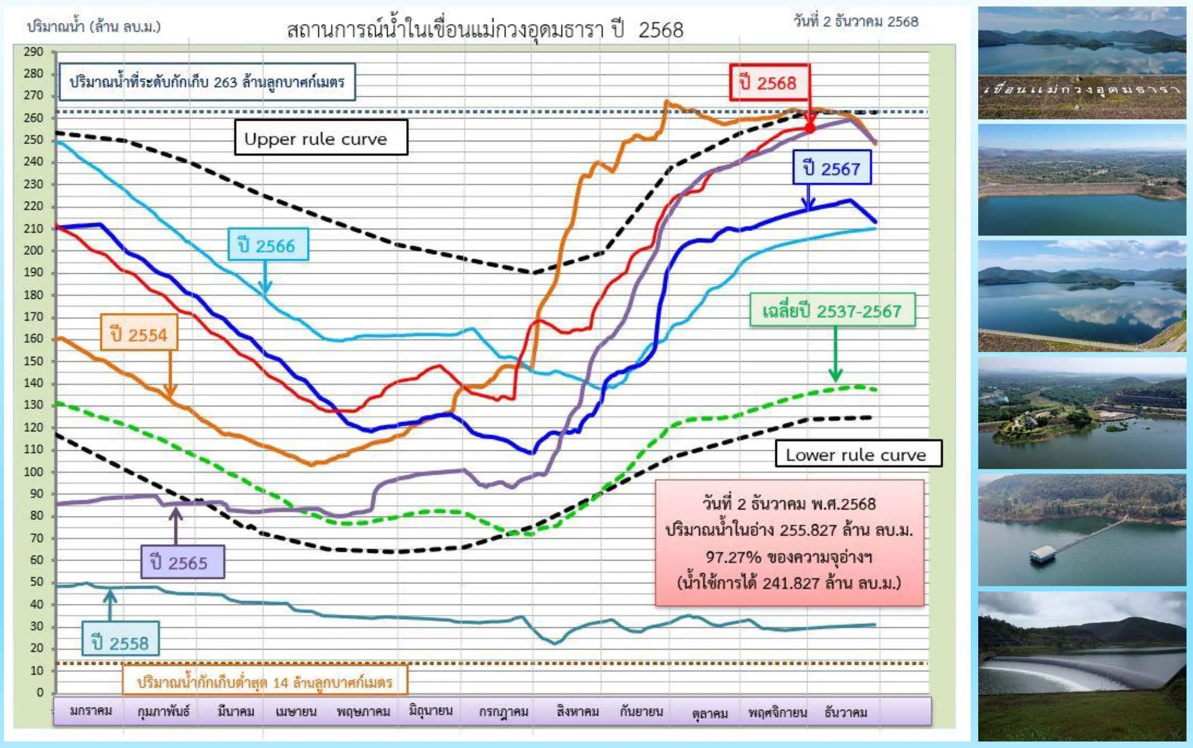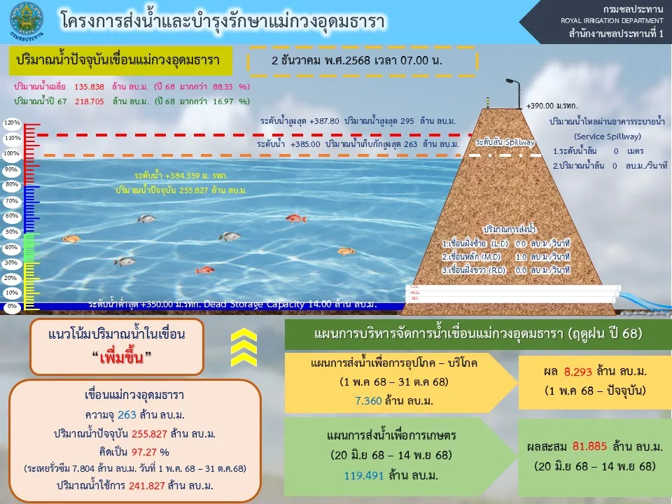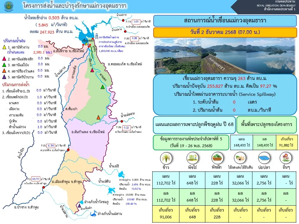 สำหรับสถานการณ์น้ำในอ่างเก็บน้ำเขื่อนแม่กวงอุดมธารา ปัจจุบันมีปริมาณน้ำกักเก็บอยู่ที่ 255.827 ล้าน ลบ.ม. คิดเป็น 97.27% ของความจุ โดยมีปริมาณน้ำใช้การได้อยู่ราว 241.827 ล้าน ลบ.ม. โดยที่ยังมีปริมาณที่ไหลเข้าอ่างเก็บน้ำเขื่อนแม่กวงฯ และแนวโน้มปริมาณน้ำในเขื่อนยังอยู่ในทิศทางที่เพิ่มขึ้น โดยที่ปริมาณน้ำขณะนี้มีมากกว่าปี 2567 ราว 16.97%
