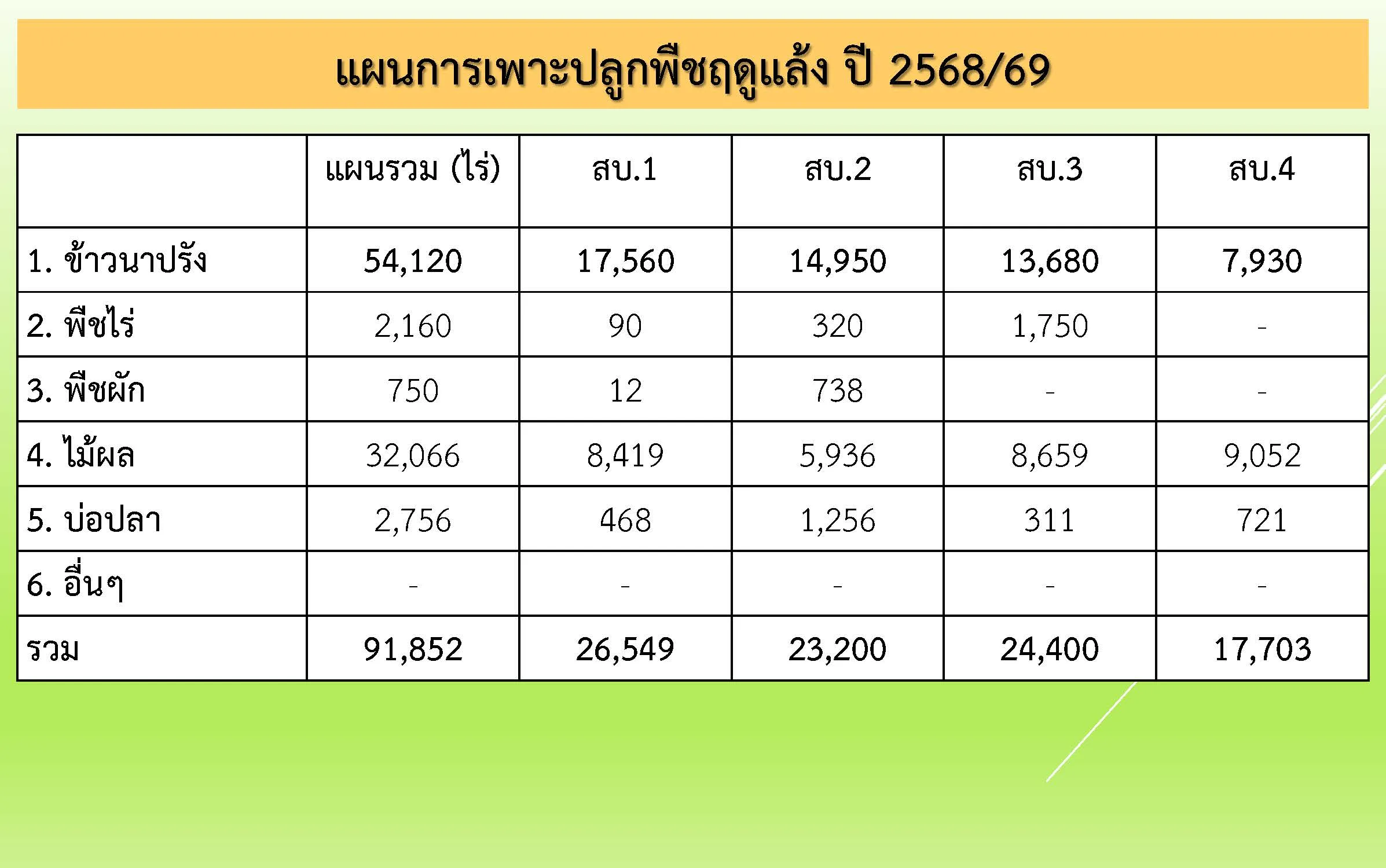 ทั้งนี้แผนการจัดสรรน้ำของเขื่อนแม่กวงอุดมธาราในช่วงฤดูแล้งปี 2568/69 โครงการฯ กำหนดความสำคัญให้กับน้ำเพื่อการอุปโภค-บริโภคเป็นอันดับแรก น้ำเพื่อรักษาระบบนิเวศน์และการท่องเที่ยว น้ำเพื่อการเกษตร และน้ำเพื่ออุตสาหกรรม ตามลำดับ โดยส่งน้ำเพื่อการอุปโภค-บริโภค ราว 6.040 ล้าน ลบ.ม. เป็นแผนส่งน้ำช่วงวันที่ 1 ธ.ค. 2568 ถึงวันที่ 30 เม.ย.2569 และมีแผนส่งน้ำเพื่อการเกษตรราว 110.538 ล้าน ลบ.ม. โดยกำหนดส่งน้ำตั้งแต่วันที่ 25 ธันวาคม 2568 ถึงวันที่ 6 พฤษภาคม 2569 สำหรับพื้นที่เพาะปลูก 91,852 ไร่ แยกเป็น นาข้าว 54,120 ไร่ ไม้ผล 32,066 ไร่ พืชไร่-พืชผัก 2,910 ไร่ และบ่อปลา 2,756 ไร่