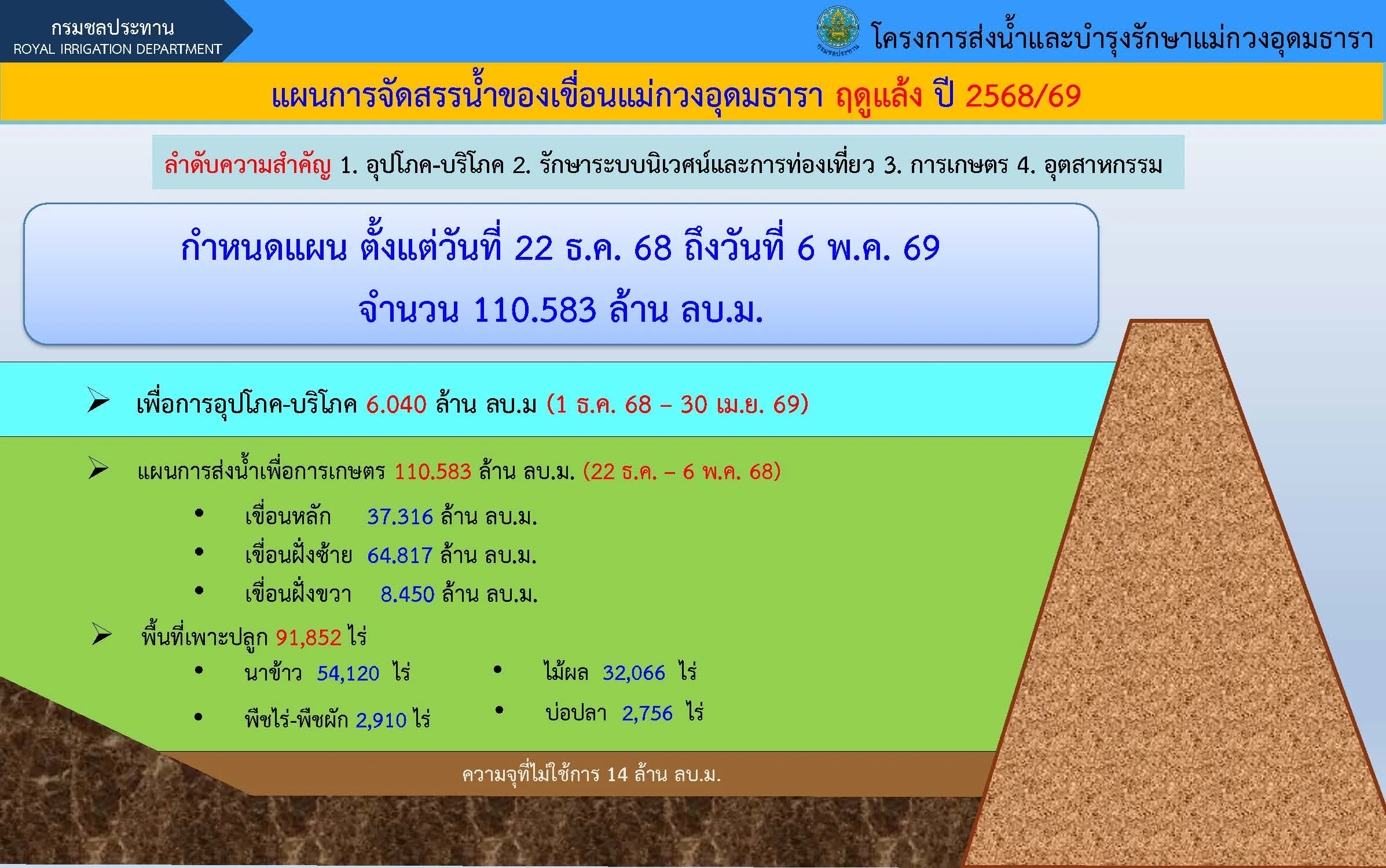 สำหรับการประชุมครั้งนี้มีวัตถุประสงค์เพื่อเตรียมความพร้อมในการวางแผนบริหารจัดการน้ำในช่วงฤดูแล้ง ปี พ.ศ.2568/69 ให้เป็นไปตามวัตถุประสงค์ของการบริหารจัดการน้ำในด้านการอุปโภค – บริโภค ระบบนิเวศการท่องเที่ยว การเกษตรและการอุตสาหกรรม เพื่อให้การบริหารจัดการน้ำเกิดประโยชน์สูงสุดแก่เกษตรกร และผู้มีส่วนได้ส่วนเสียทุกภาคส่วน