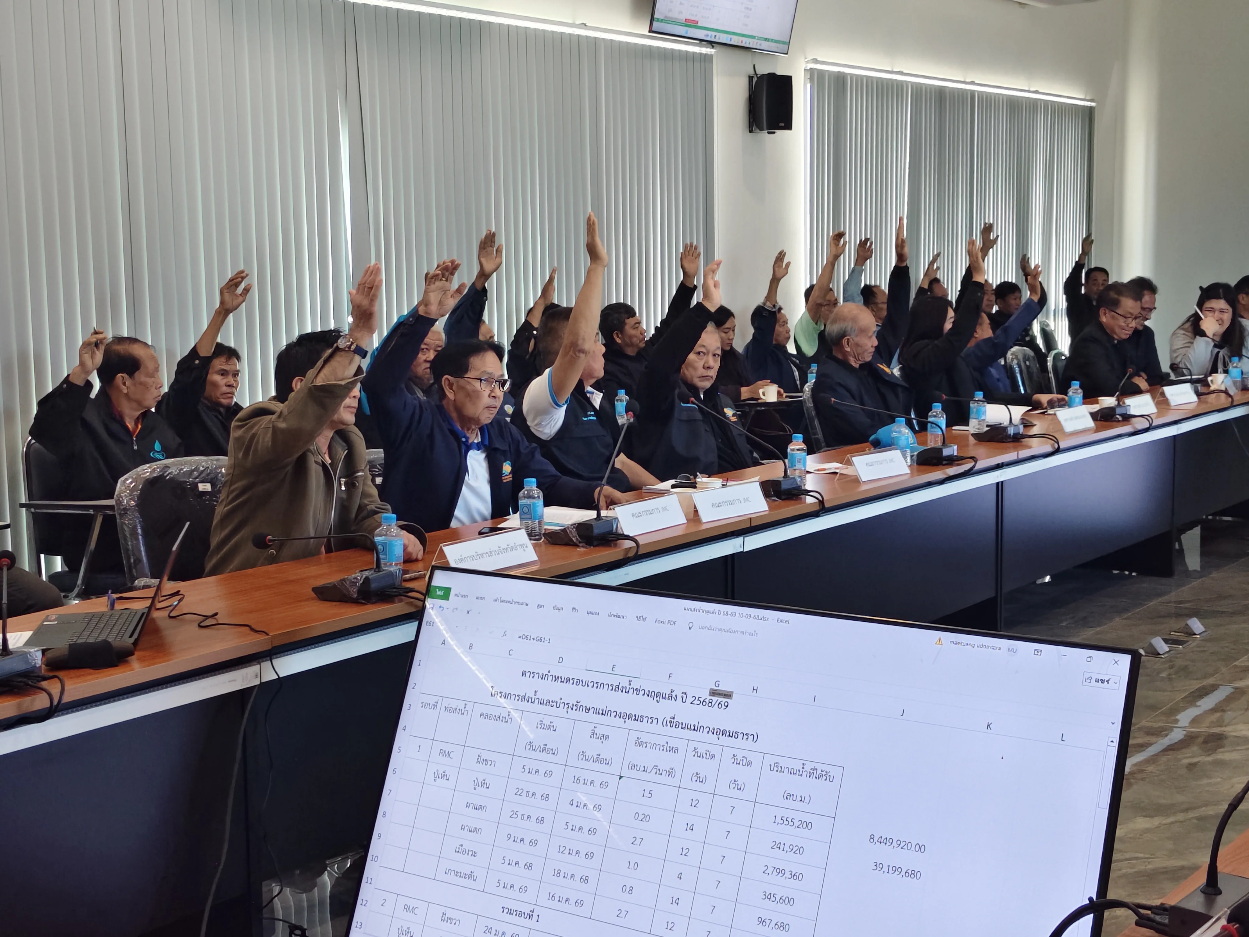 ในส่วนของเวทีการประชุม ที่ประชุมเปิดโอกาสให้ทุกฝ่าย รวมถึงผู้ใช้น้ำในพื้นที่บริการของคลองส่งน้ำสายต่างๆ ได้แสดงความเห็นกันอย่างเต็มที่ โดยมีมติวางแผนให้ส่งน้ำแบบรอบเวรโดยรอบแรกเริ่มในวันที่ 25 ธันวาคม 2568 (คลองส่งน้ำสายใหญ่ฝั่งซ้าย เริ่มส่งรอบแรกวันที่ 25 ธันวาคม 2568 คลองส่งน้ำสายใหญ่ฝั่งขวา เริ่มส่งรอบแรกวันที่ 5 มกราคม 2569 คลองส่งน้ำ Main Dam เริ่มส่งรอบแรกวันที่ 5 มกราคม 2569 ) โดยกลุ่มผู้ใช้น้ำต้องร่วมกันขุดลอกคลองและกำจัดวัชพืชก่อนส่งน้ำตามกำหนด โดยเรื่องใหม่สำหรับการส่งน้ำช่วงแล้ง 68/69 คือ การส่งน้ำเขื่อนฝั่งซ้าย ที่มีมติส่งให้ตอนท้ายสุดของคลองก่อน โดยส่งให้พื้นที่ฝ่ายส่งน้ำและบำรุงรักษาที่ 4 ซึ่งเป็นพื้นที่ใน จ.ลำพูน ได้ใช้ก่อน โดยกำหนดส่งให้ในวันที่ 25 ธ.ค. 68 ถึง 5 ม.ค. 69 จากนั้นส่งให้ตอนต้นๆ คลองได้ใช้ คือ พื้นที่ฝ่ายส่งน้ำและบำรุงรักษาที่ 2 และ 3 ส่งในวันที่ 6 – 17 ม.ค. 69 และมีมติร่วมกันด้วยว่า ช่วงส่งน้ำให้พื้นที่ฝ่ายส่งน้ำและบำรุงรักษาที่ 4 ตอนต้นห้ามลักลอบใช้น้ำโดยเด็ดขาด หากฝ่าฝืนจะดำเนินการตามพระราชบัญญัติการชลประทานหลวง พ.ศ.2485