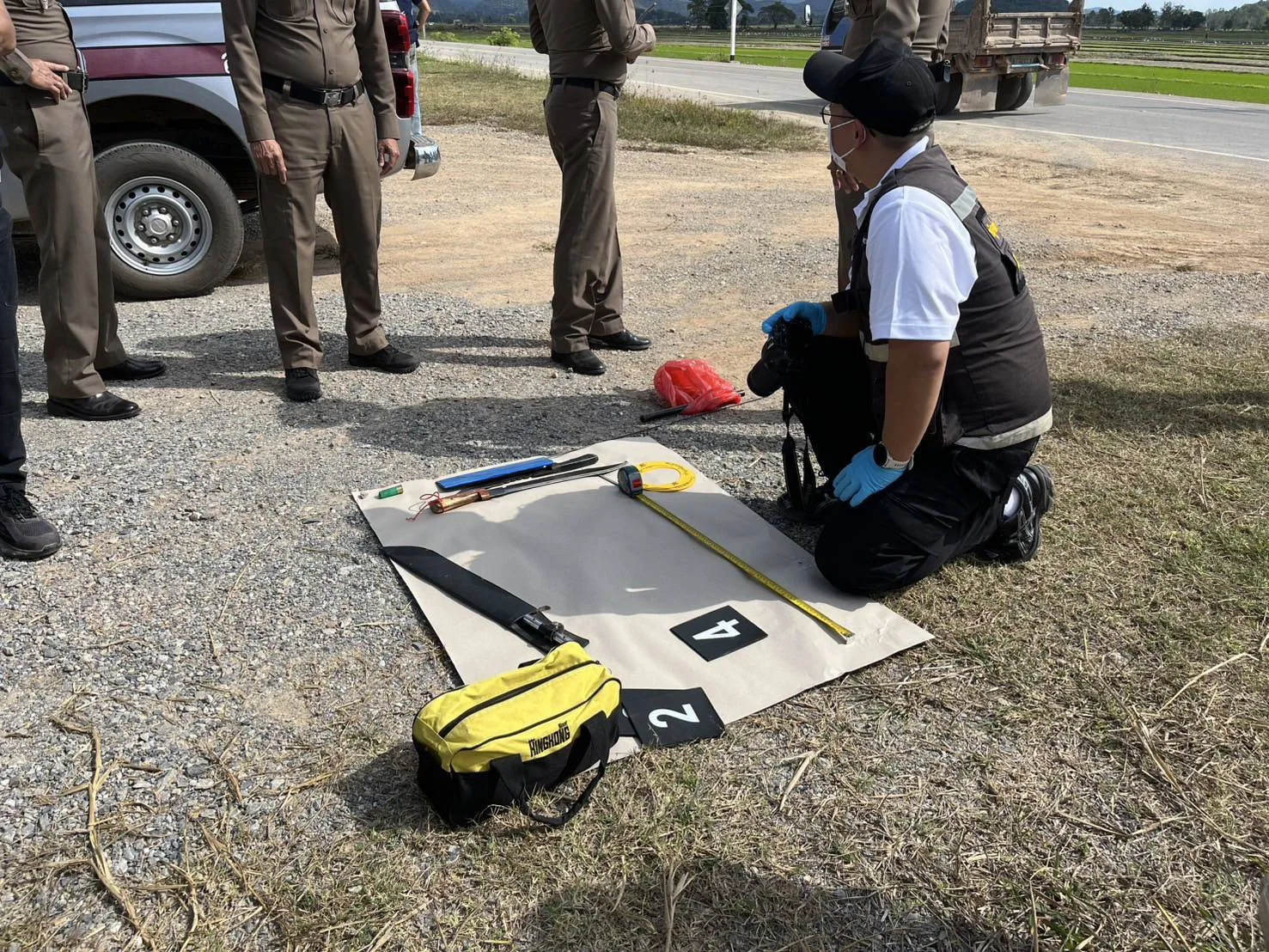 ผู้สื่อข่าวได้ลงพื้นที่ไปติดตามกรณีดังกล่าว พบว่าในช่วงบ่ายวันนี้ได้มีเจ้าหน้าที่ตำรวจ สภ.ป่าแดด และหน่วยพิสูจน์หลักฐานจังหวัดเชียงราย ได้มาตรวจพื้นที่เกิดเหตุ และสามารถตรวจยึดอาวุธของกลางที่ถูกซุกซ่อนอยู่ใกล้ที่เกิดเหตุได้หลายอย่าง ทั้งมีดปลายแหลม และปลอกกระสุนปืนไม่ทราบขนาด คาดว่าเป็นอาวุธสังหารจะเป็นปืนลูกซอง แต่จากการตรวจสอบพื้นที่โดยรอบพบว่าเป็นพื้นที่ห่างไกลชุมชน ไม่มีผู้เห็นเหตุการณ์ขณะเกิดเหตุ แต่เจ้าหน้าที่ได้ขอดูภาพวงจรปิดบริเวณใกล้เคียงเพื่อตรวจสอบแล้ว ในเบื้องต้นจากการสอบถามผู้บาดเจ็บ เจ้าหน้าที่พอจะระบุกลุ่มผู้ก่อเหตุได้ในเบื้องต้นแล้ว คาดเป็นกลุ่มวัยรุ่นแถว ต.ป่าแงะ อ.ป่าแดด และมีวัยรุ่น ต.ดอยลาน อ.เมืองเชียงราย มาร่วมทำร้ายด้วย ล่าสุดทาง พล.ต.ต.มานพ เสนากูล ผบก.ภ.จว.เชียงราย ได้ทราบเรื่องจึงสั่งการให้ชุดสืบสวนภูธรจังหวัดเชียงรายมาร่วมทำงานกับ สภ.ป่าแดด ซึ่งทาง พ..ต.อ.กุลชาติ ศักดิโยธินธาดา ผกก.สภ.ป่าแดด ก็ได้สั่งการให้เจ้าหน้าที่ผู้รับผิดชอบคดี เร่งรัดการทำงานเพื่อตามจับผู้ก่อเหตุมาดำเนินคดีโดยเร็ว เพราะเป็นเหตุสะเทือนขวัญ เป็นที่สนใจของสังคม