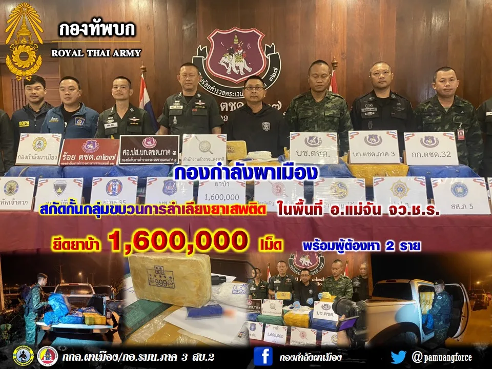 กองกำลังผาเมือง สกัดกั้นจับกุมขบวนการลักลอบลำเลียงยาเสพติด ยึดยาบ้า จำนวน 1,600,000 เม็ด ผู้ต้องหา 2 ราย ในพื้นที่ จังหวัดเชียงราย
