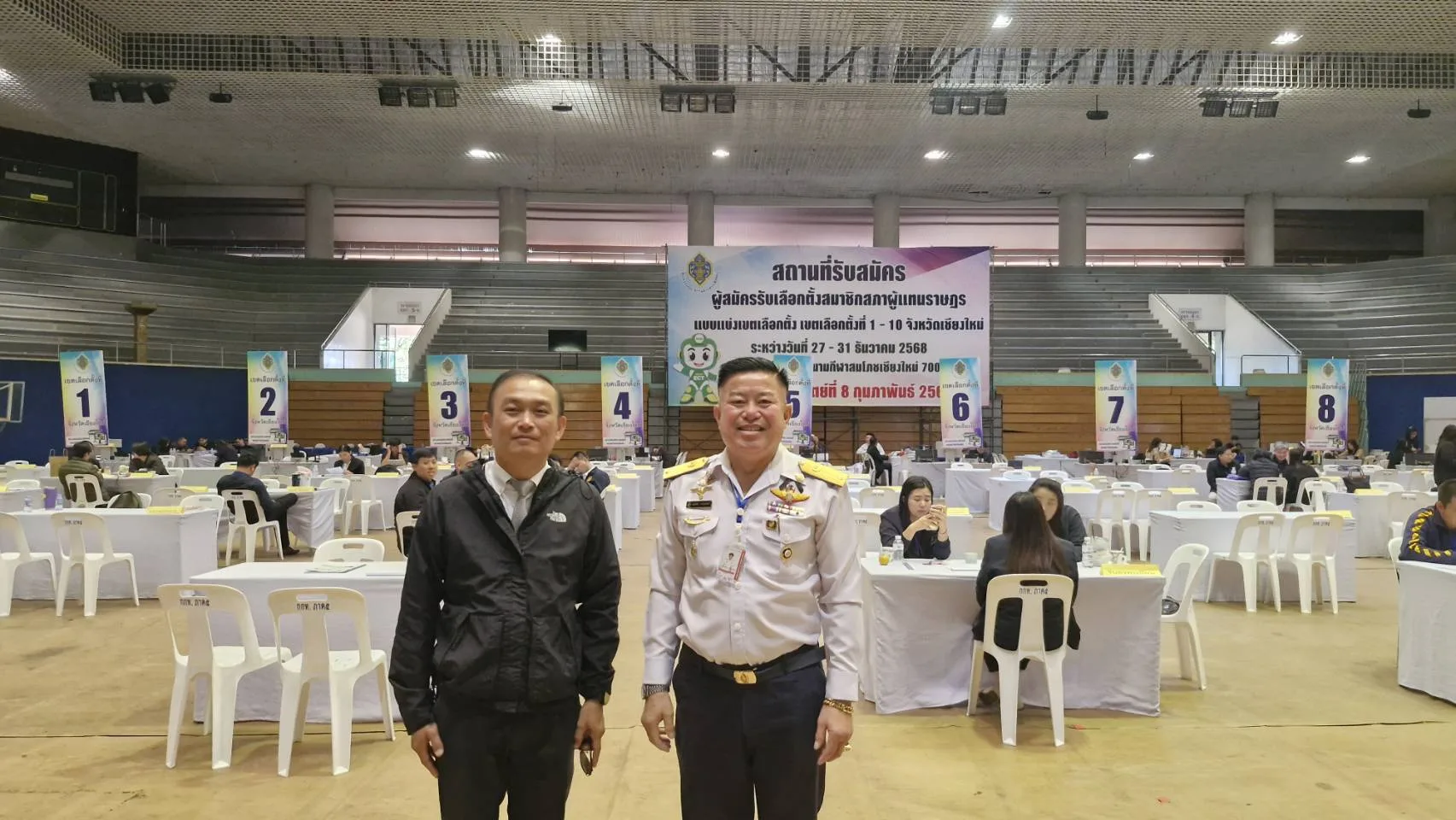 เมื่อวันที่ 29 ธันวาคม 2568 เวลา 10.00 น. นายสงค์ศักย์ คำดีรุ่งริรัตน์ ผอ.กกท.ภาค 5 เชียงใหม่ ได้ไปตรวจเยี่ยมและให้กำลังใจเจ้าหน้าที่ ในการรับสมัครสมาชิกสภาผู้แทนราษฎร (ส.ส.) แบบแบ่งเขตเลือกตั้ง ของจังหวัดเชียงใหม่ ทั้ง 10 เขต ณ บริเวณภายในโรงพลศึกษา 2 สนามกีฬาสมโภชเชียงใหม่ 700 ปี ซึ่งเป็นงานรับสมัคร ส.ส. เป็นวันที่ 3 ซึ่งบรรยากาศ โดยทั่วไปเป็นไปด้วยความเรียบร้อย มี ผู้อำนวยการการเลือกตั้งประจำจังหวัดเชียงใหม่ พร้อมเจ้าหน้าที่และรองผู้กำกับการสถานีตำรวจภูธร แม่ริม และกำลังเจ้าที่ตำรวจมาช่วยดูแลรักษาความสงบเรียบร้อยภายในพื้นที่ด้วย