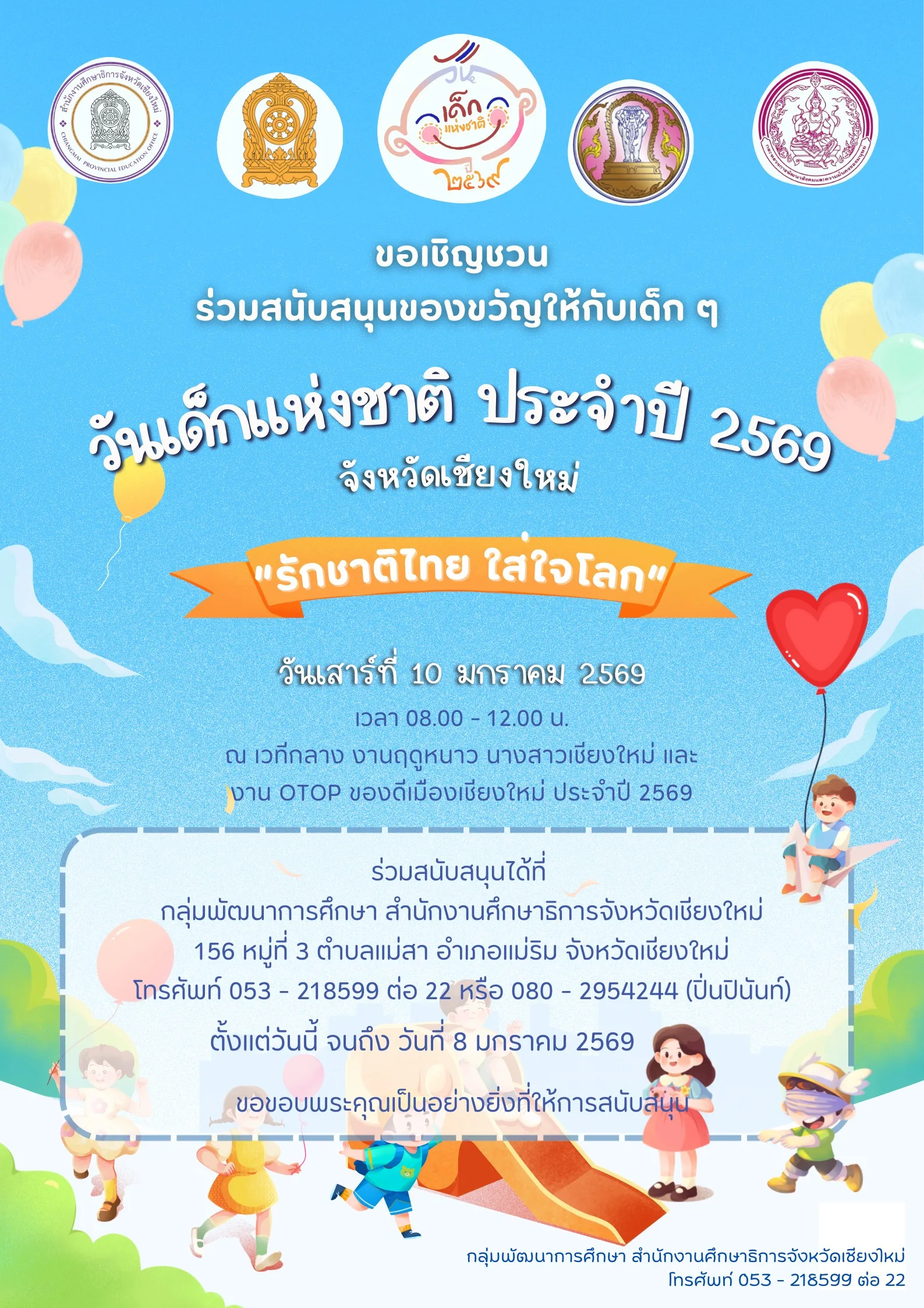 จึงขอเชิญชวนหน่วยงานและสถานศึกษา ร่วมสนับสนุนของขวัญให้กับเด็ก ๆ ในงาน โดยร่วมสนับสนุนได้ที่กลุ่มพัฒนาการศึกษา สำนักงานศึกษาธิการจังหวัดเชียงใหม่ ตั้งแต่วันนี้ จนถึง วันที่ 8 มกราคม 2569