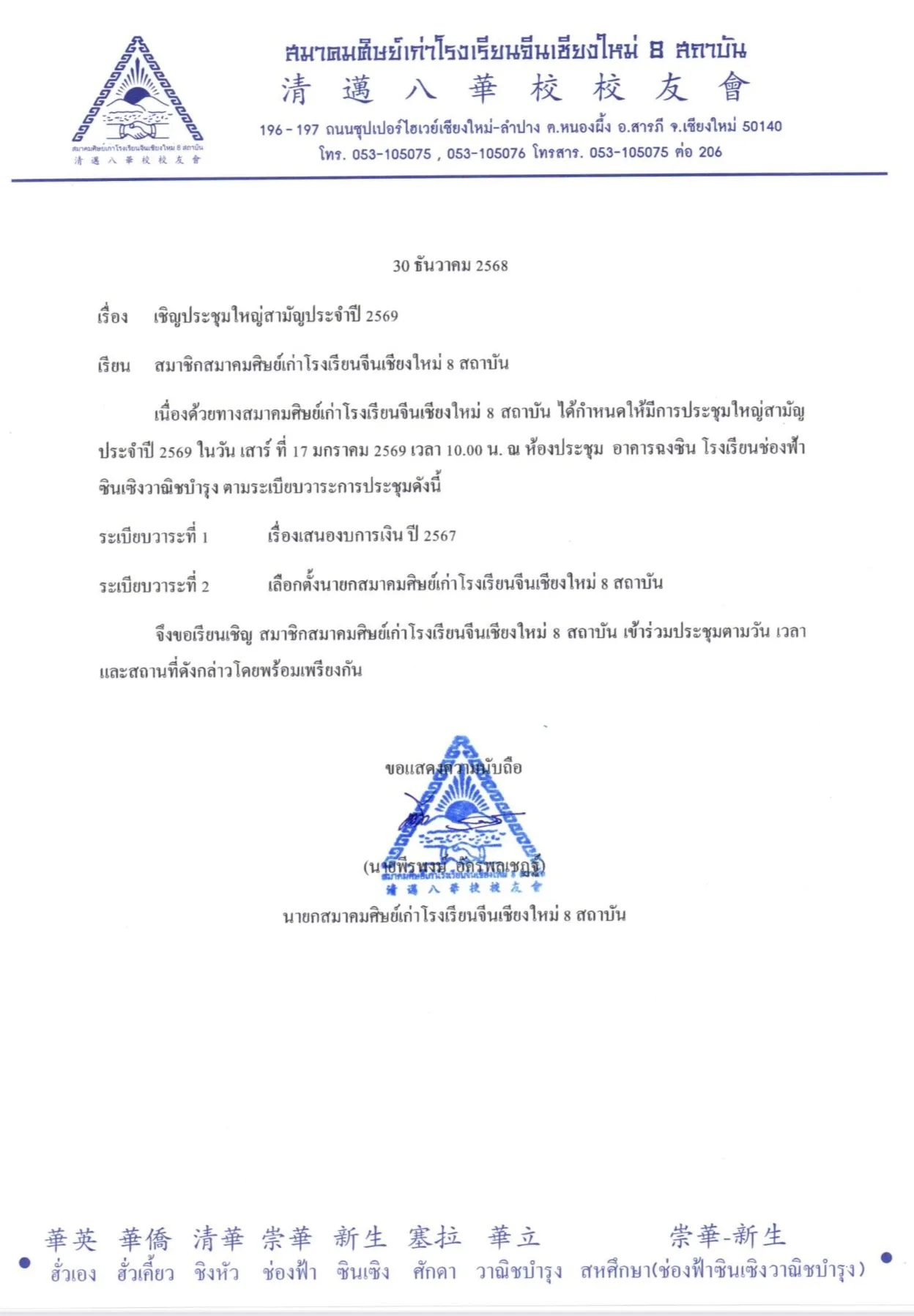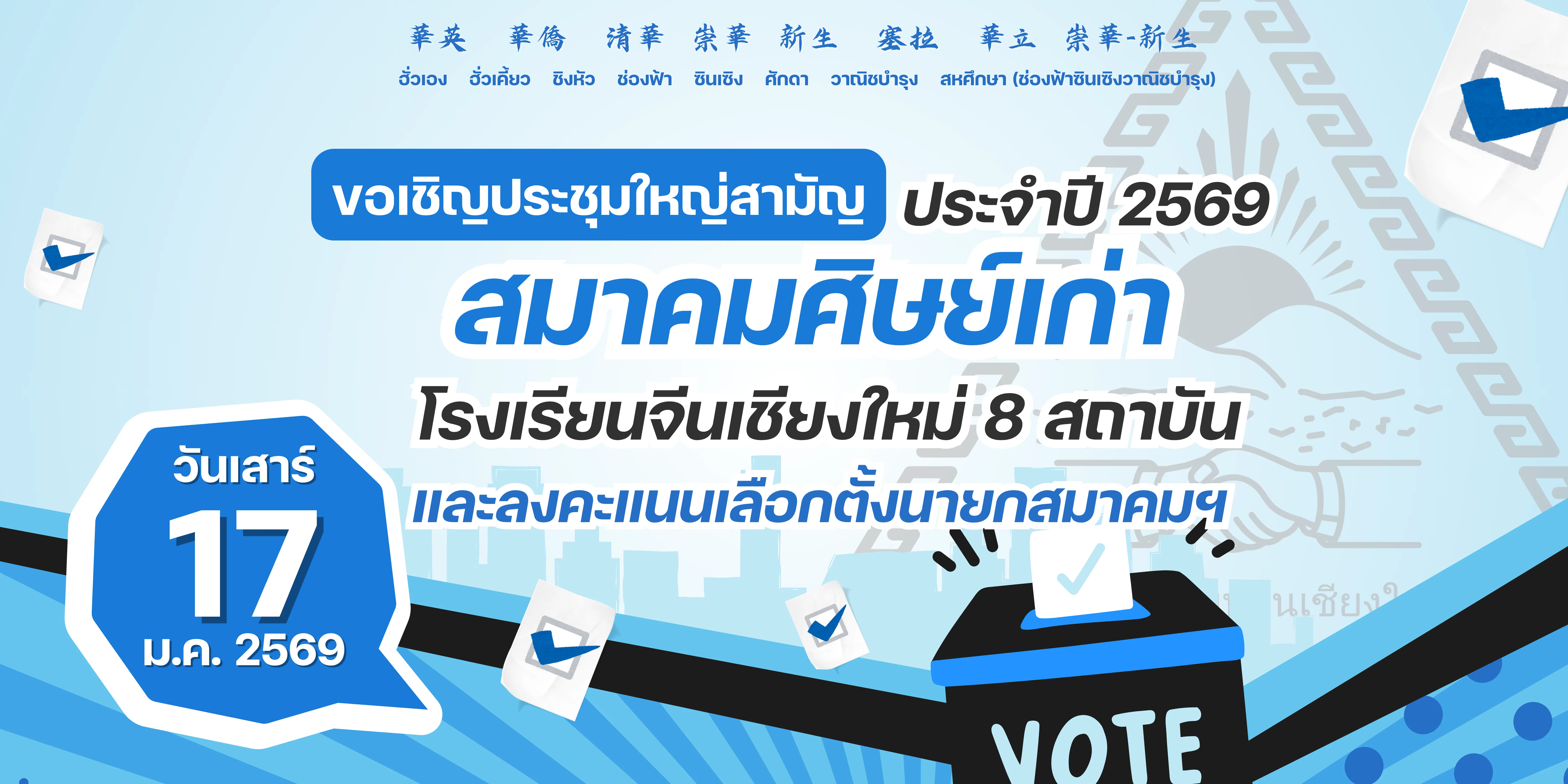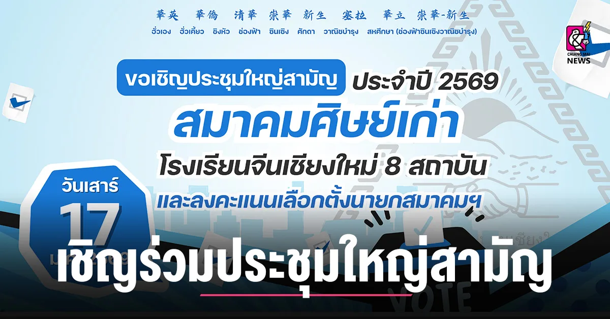 สมาคมศิษย์เก่าโรงเรียนจีนเชียงใหม่ 8 สถาบัน ขอเชิญสมาชิกเข้าร่วมการประชุมใหญ่สามัญประจำปี 2569 เพื่อรับทราบผลการดำเนินงานของสมาคมฯ และร่วมกันพิจารณาเลือกตั้งนายกสมาคมฯ คนใหม่ ตามระเบียบวาระที่กำหนด