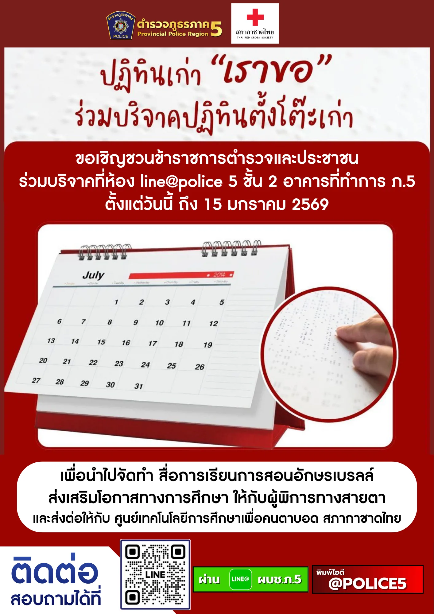 ตำรวจภูธรภาค 5 ขอเชิญชวนข้าราชการตำรวจ และประชาชนร่วมบริจาคปฏิทินตั้งโต๊ะเก่า เพื่อนำไปจัดทำสื่อการเรียนการสอนอักษรเบรลล์ ส่งเสริมโอกาสทางการศึกษาให้กับผู้พิการทางสายตา โดยจะส่งต่อให้กับ ศูนย์เทคโนโลยีการศึกษาเพื่อคนตาบอด ของสภากาชาดไทย