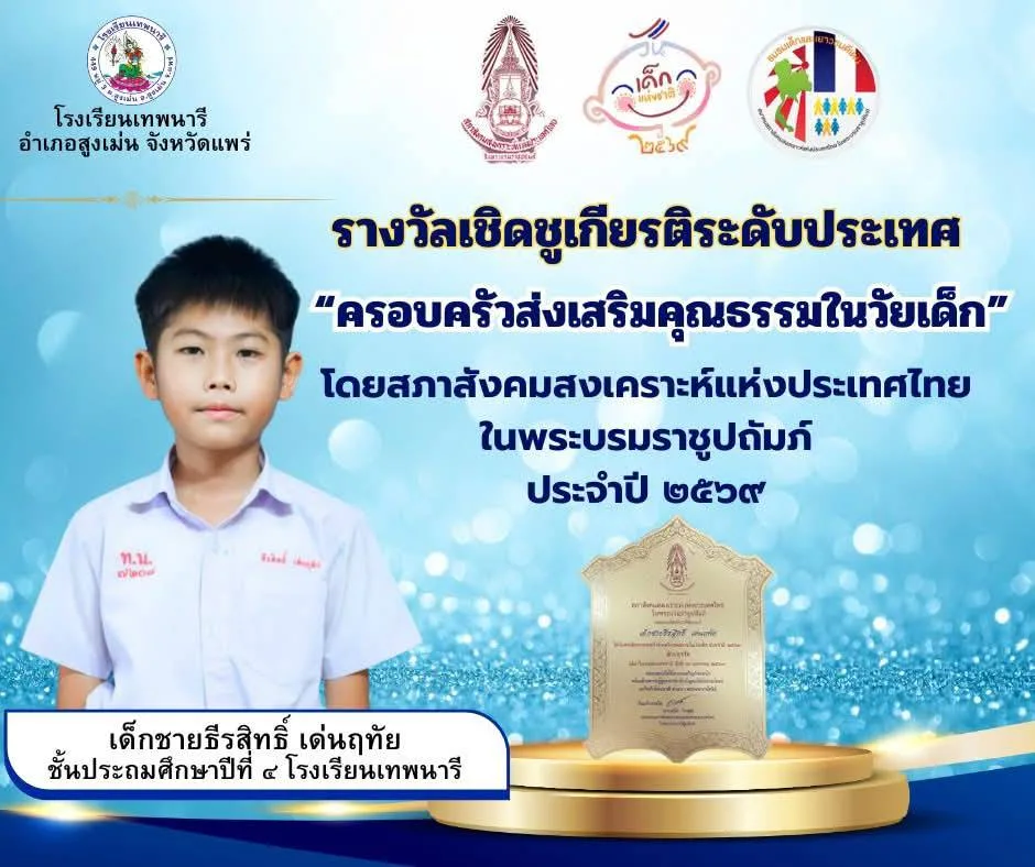 โรงเรียนเทพนารีโดย เด็กชายธีรสิทธิ์ เด่นฤทัย นักเรียนชั้นประถมศึกษาปีที่ 4 โรงเรียนเทพนารี ได้รับคัดเลือกเป็นผู้แทนครอบครัวส่งเสริมคุณธรรมในวัยเด็ก ผู้มีความประพฤติดี มีคุณธรรม และความสุจริตเชิงประจักษ์ ระดับประเทศ เข้ารับทุนการศึกษา โล่เกียรติคุณ และกระเป๋านักเรียนพระราชทาน พิธีดังกล่าวจัดขึ้น ณ ห้องประชุม ชั้น ๓ ตึกนวมหาราช สภาสังคมสงเคราะห์แห่งประเทศไทย ในพระบรมราชูปถัมภ์ เขตราชเทวี กรุงเทพมหานคร