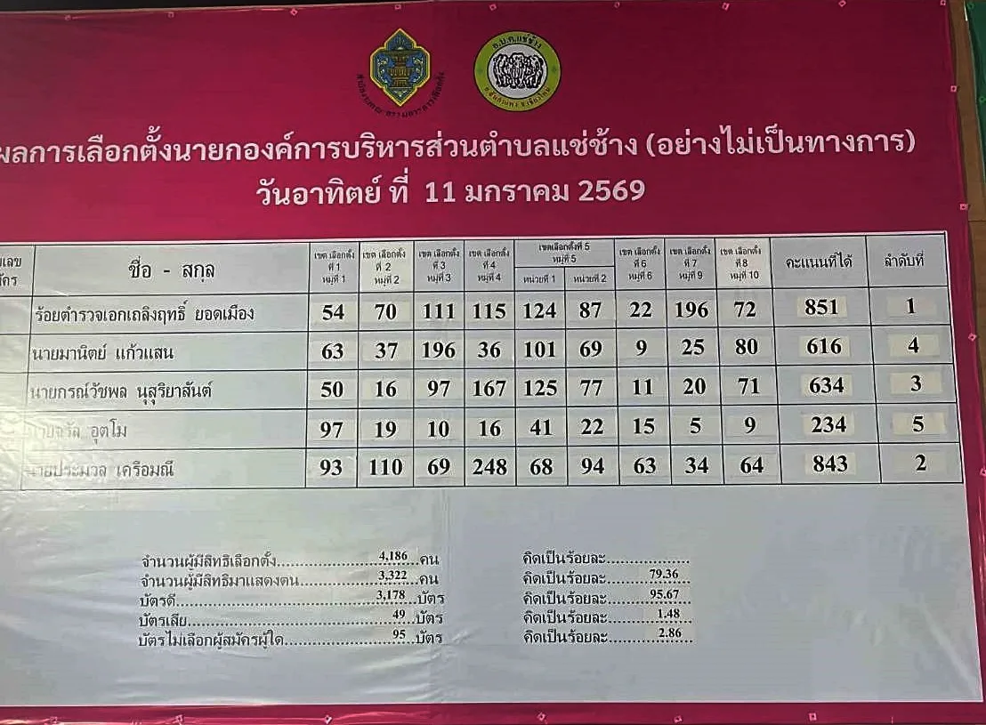 เมื่อวันที่ 11 ม.ค.68 ตั้งแต่เวลา 08.00 น.เป็นต้นไป ซึ่งมีการเลือกตั้ง อบต.ทั่วประเทศ ส่วนที่ อบต.แช่ช้าง อ.สันกำแพง จ.เชียงใหม่ มีผู้ลงรับสมัคร นายก อบต.จำนวน 5 คน เบอร์ 1 ร.ต.อ.เถลิงฤทธิ์ ยอดเมือง ได้ 851คะแนน เบอร์ 2 นายมานิตย์ แก้วแสน ได้ 616 คะแนน เบอร์ 3 นายกรณ์วัชพล นุสุริยาสันต์ ได้ 634 คะแนน เบอร์ 4 นายจรัล อุตโม ได้ 234 คะแนน และเบอร์ 5 นายประมวล เครือมณี ได้ 843 คะแนน และสมาชิก ส.อบต. อีก 8 คน มี 8 หมู่บ้านในพื้นที่ได้ครบทุกหมู่บ้าน