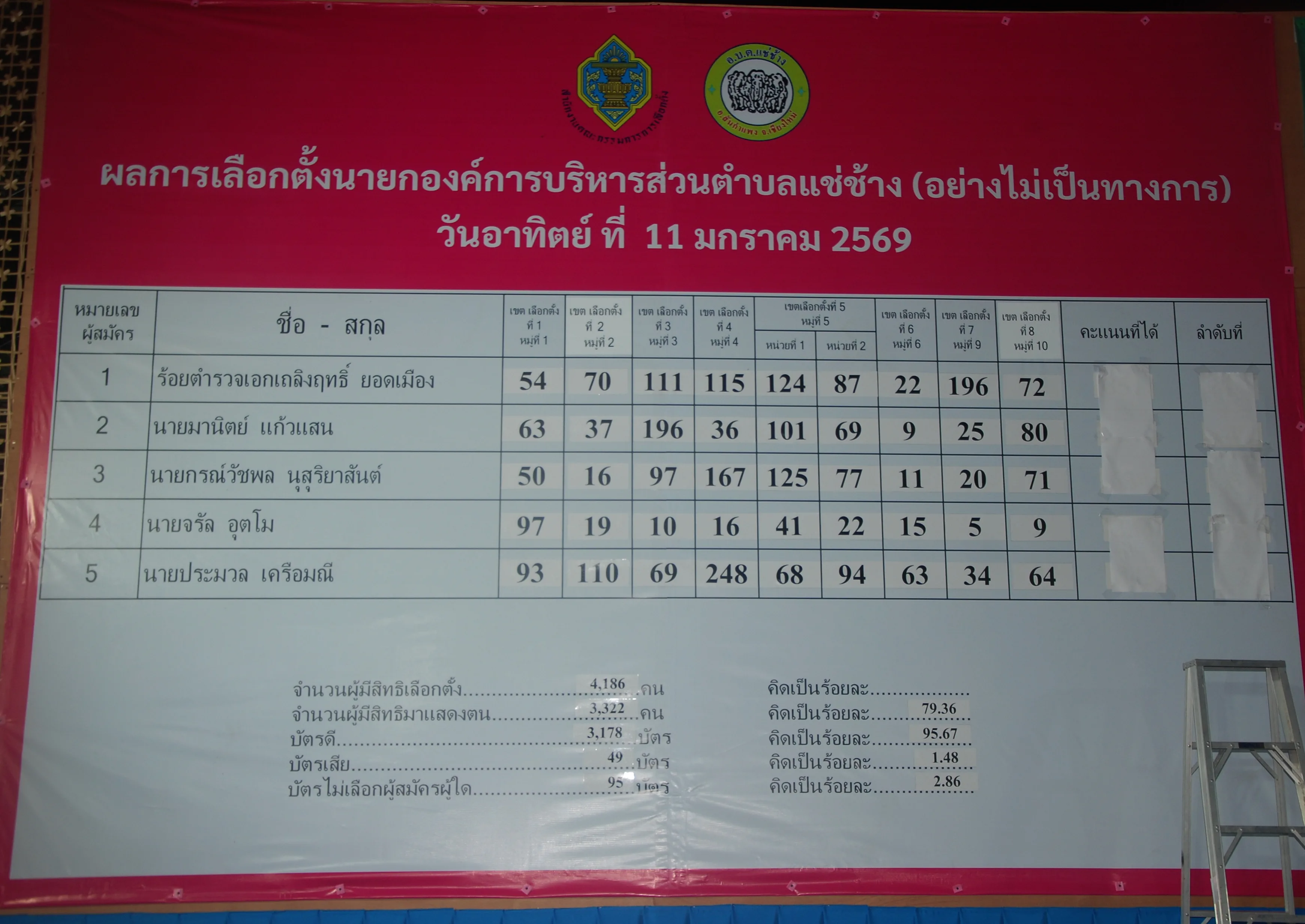 อบต.แช่ช้าง อ.สันกำแพง ผลคะแนน อย่างไม่เป็นทางการ ร.ต.อ.เถลิงฤทธิ์ ยอดเมือง ชนะคู่แข่งไปเพียง 8 คะแนน