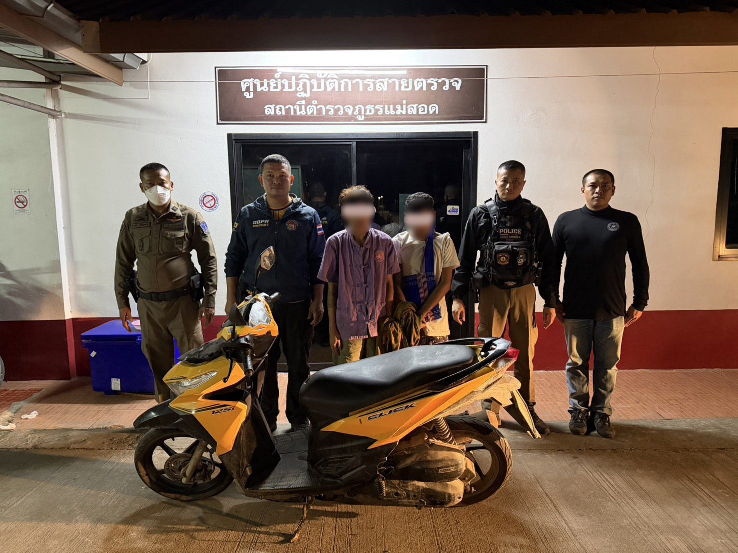 ขณะปฏิบัติหน้าที่ พบกลุ่มบุคคลต้องสงสัยจึงติดตามดูพฤติกรรมพบกลุ่มคนดังกล่าวได้ก่อเหตุซึ่งหน้า ทำการลักรถจักรยานยนต์ เจ้าหน้าที่จึงเข้าแสดงตน พบของกลาง รถจักรยานยนต์ฮอนด้า คลิก สีเหลืองเลขทะเบียนตาก จึงได้ร่วมกันจับกุมตัวได้ 2 ราย 1.)ด.ช.เวยานเพียว ไม่มีชื่อสกุล อายุ 16 ปี ไม่มีที่อยู่เป็นหลักแหล่ง 2.)ด.ช.โพเมี๊ยะอากา ไม่มีชื่อสกุล อายุ 14 ปี ไม่มีที่อยู่เป็นหลักแหล่ง จึงนำตัวส่งให้เจ้าหน้าที่ตำรวจ สภ.แม่สอด ดำเนินคดีตามกฎหมายต่อไป