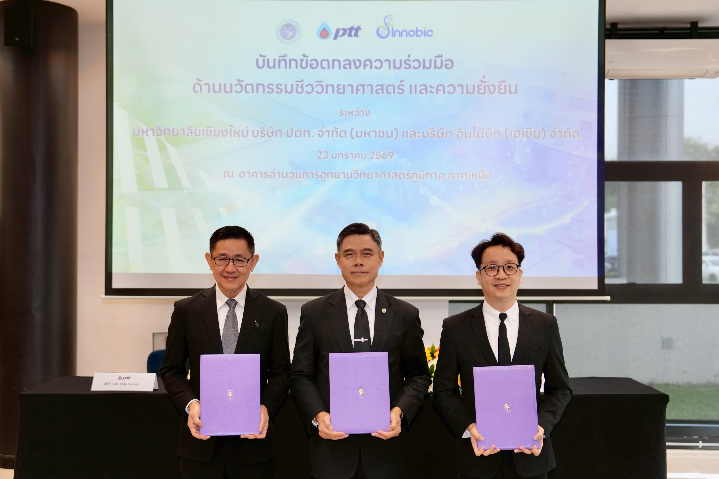 วันศุกร์ที่ 23 มกราคม 2569 มหาวิทยาลัยเชียงใหม่ (มช.) ลงนามบันทึกข้อตกลงความร่วมมือด้านนวัตกรรมชีววิทยาศาสตร์และความยั่งยืน ร่วมกับ บริษัท ปตท. จำกัด (มหาชน) และ บริษัท อินโนบิก (เอเซีย) จำกัด โดยมีเป้าหมายเพื่อส่งเสริมการพัฒนาประเทศในมิติเศรษฐกิจ สังคม และสิ่งแวดล้อมอย่างยั่งยืน ผ่านการบูรณาการองค์ความรู้ งานวิจัย และนวัตกรรมสู่การใช้ประโยชน์จริง โดยพิธีลงนามในครั้งนี้ ได้รับเกียรติจาก ศาสตราจารย์ ดร.นพ.พงษ์รักษ์ ศรีบัณฑิตมงคล อธิการบดีมหาวิทยาลัยเชียงใหม่ ร่วมด้วย ดร.บุรณิน รัตนสมบัติ ประธานเจ้าหน้าที่ปฏิบัติการกลุ่มธุรกิจใหม่และความยั่งยืน บริษัท ปตท. จำกัด (มหาชน) และ ดร.ณัฐ อธิวิทวัส กรรมการผู้จัดการใหญ่ บริษัท อินโนบิก (เอเซีย) จำกัด