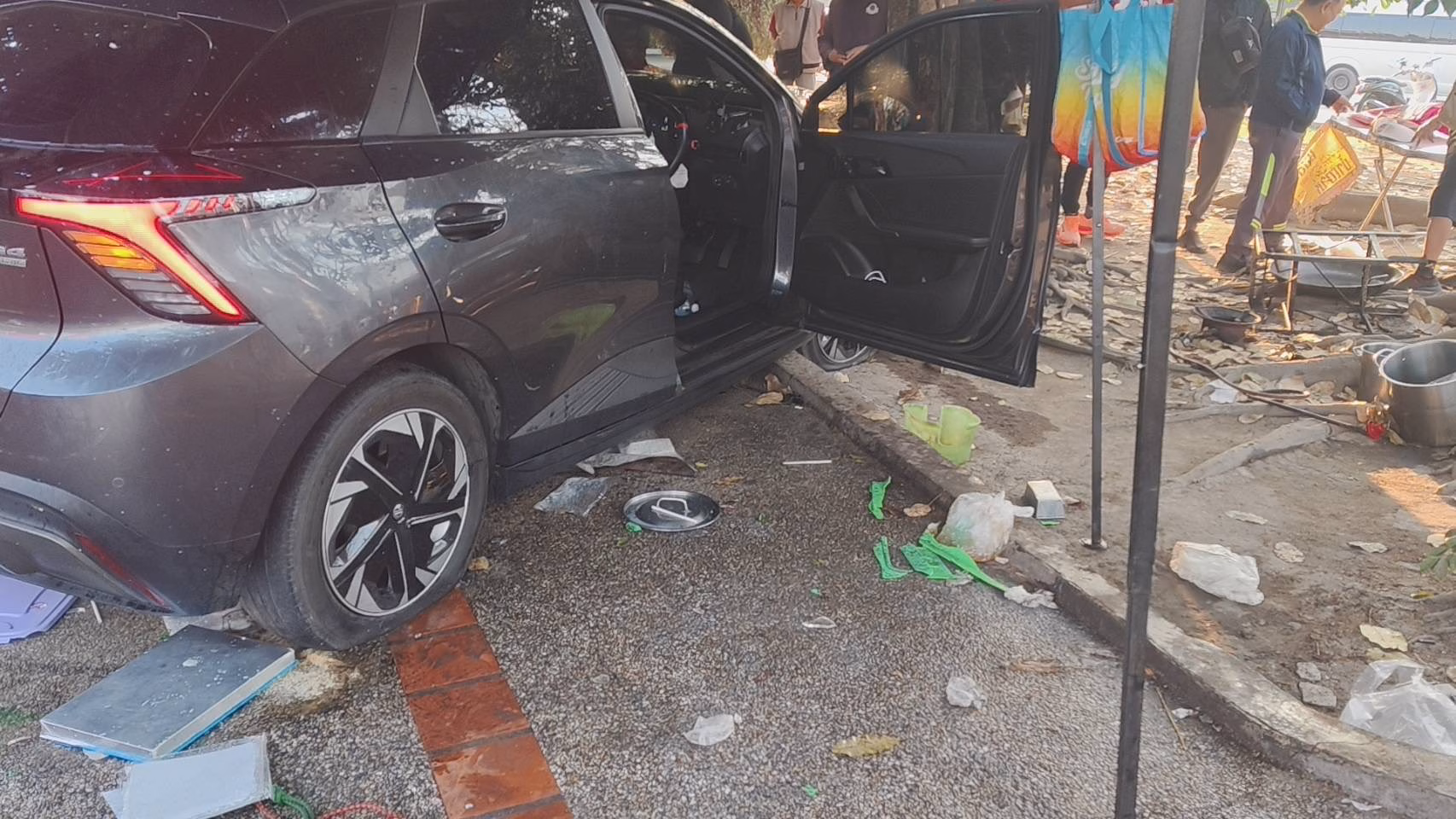 เมื่อไปถึงที่เกิดเหตุพบรถเก๋งยี่ห้อ MG รถไฟฟ้า สีดำ ทะเบียนเชียงใหม่ ชนเต้นท์ร้านขายน้ำเต้าหู้ อยู่ในเต้นท์และชนต้นไม้บนลานฟุตบาทบริเวณประตูเมืองเชียงใหม่ดังกล่าวรถเก๋งด้านหน้าพังเสียหาย ในที่เกิดเหตุพบนักท่องเที่ยวชาวสเปน เป็นหญิงบาดเจ็บสาหัส ส่วนนักท่องเที่ยวชายแฟนบาดเจ็บเล็กน้อย และร้านขายน้ำเต้าหู ร้านเต้นท์ชั่วคราวพังเสียหาย ส่วนคนเจ็บทางเจ้าหน้าที่กู้ภัยฯ ได้นำตัวส่ง รพ.มหาราชเป็นการด่วน เป็นนักท่องเที่ยวหญิงชาวสเปนสาหัส และ แม่ค้าขายน้ำเต้าหู้ เป็นหญิงสาหัสเช่นกัน ส่วนคนขับรถแกร็ป ทางตำรวจได้นำตัวไปสอบปากคำที่ โรงพักทันที บาดเจ็บเล็กน้อย นอกจากนี้ยังพบรถจักรยานยนต์ที่จอดอยู่ได้รับความเสียหายด้วย 1 คัน