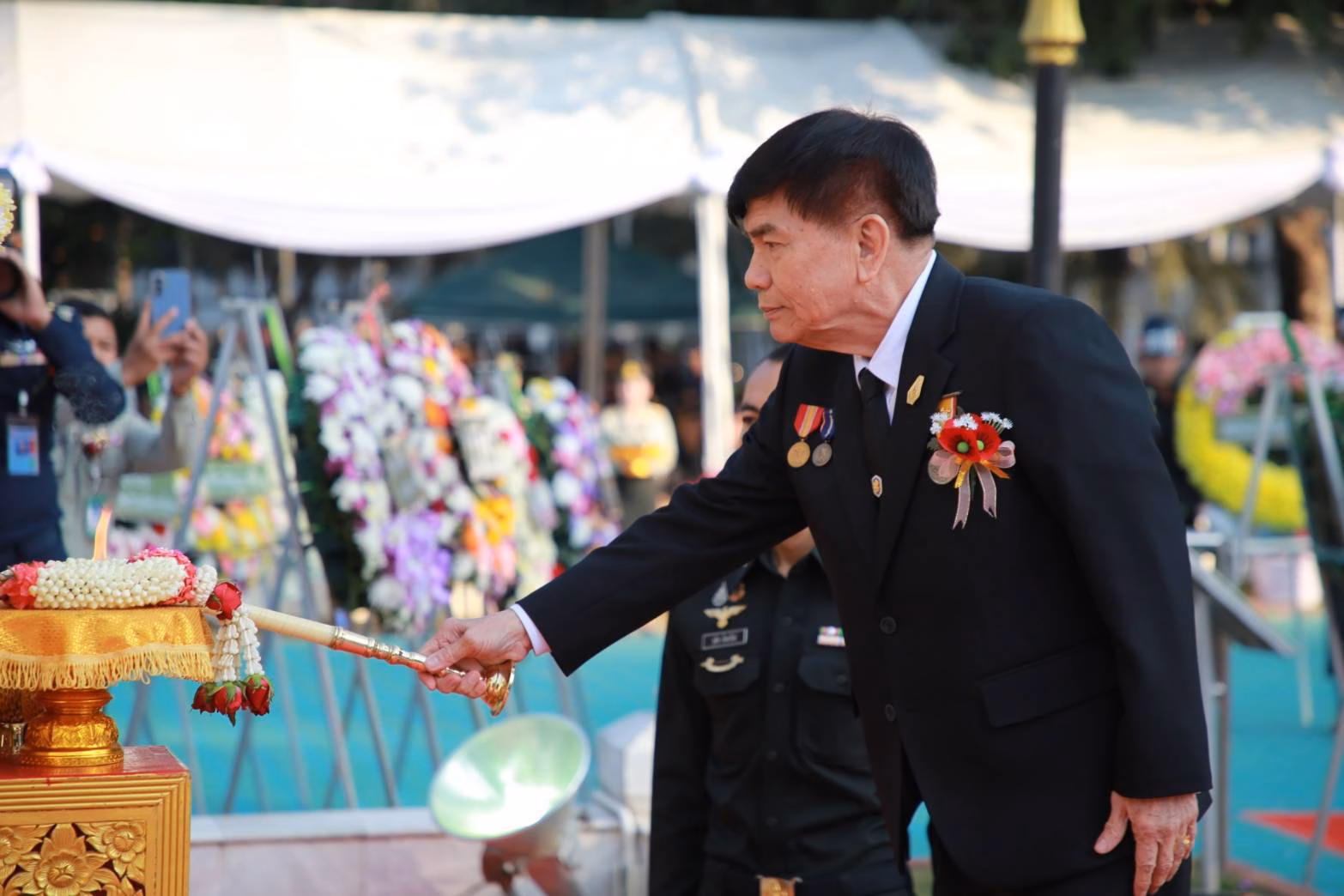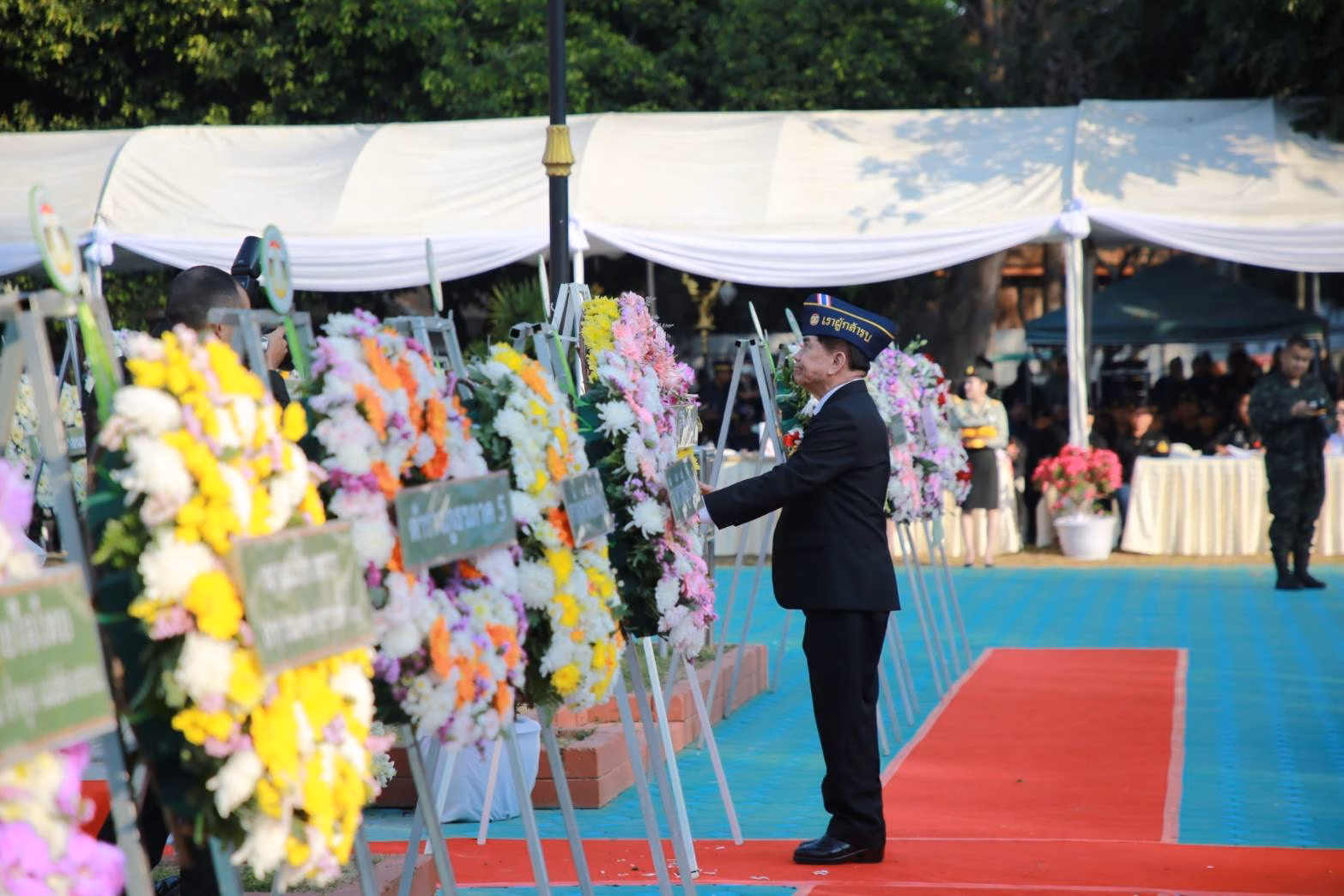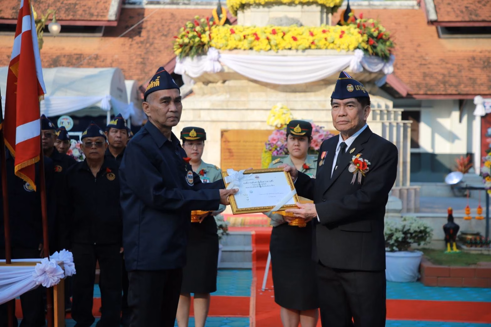 ทหารผ่านศึกที่เหล่าทหารกล้าได้มารวมตัวกันเพื่อวางพวงมาลาที่อนุสรณ์สถานพระเจ้ากาวิละ ค่ายกาวิละ จังหวัดเชียงใหม่