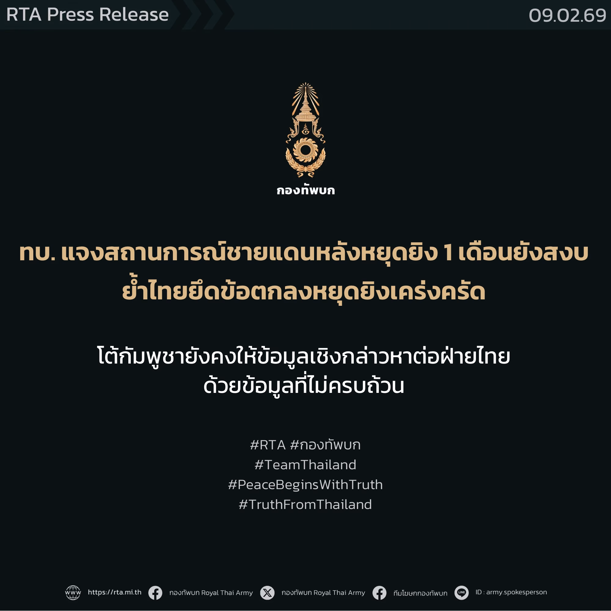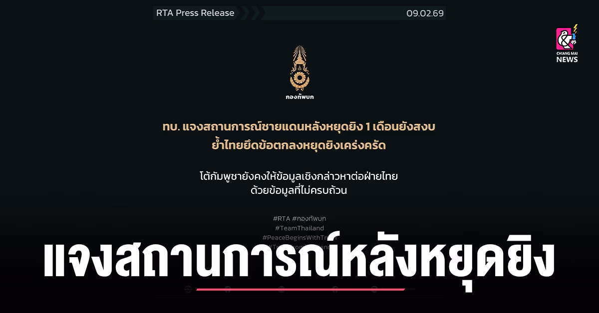 ทบ. แจงสถานการณ์ชายแดนหลังหยุดยิง 1 เดือนยังสงบ ย้ำไทยยึดข้อตกลงหยุดยิงเคร่งครัด โต้กัมพูชายังคงให้ข้อมูลเชิงกล่าวหาต่อฝ่ายไทย ด้วยข้อมูลที่ไม่ครบถ้วน