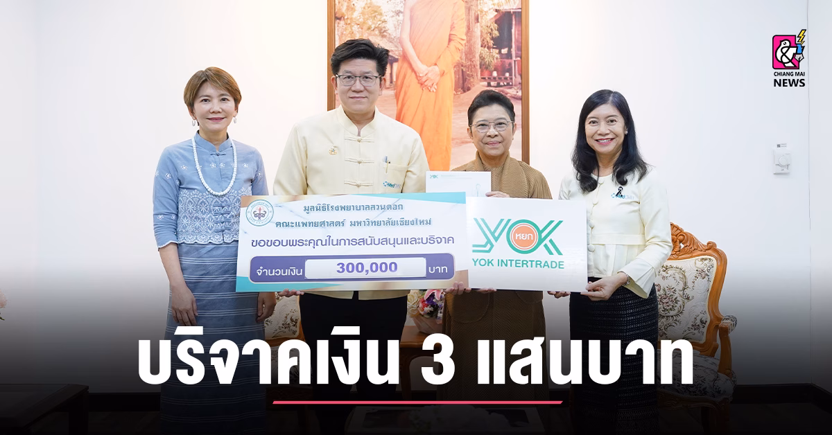 รศ.นพ.นเรนทร์ โชติรสนิรมิต คณบดีคณะแพทยศาสตร์ มช. พร้อมด้วย ผศ.พญ.พุดตาน วงศ์ตรีรัตนชัย รองคณบดีด้านสื่อสารองค์กร และคุณพัชรา อุบลศรี ที่ปรึกษาประธานมูลนิธิโรงพยาบาลสวนดอก คณะแพทยศาสตร์ มช. รับมอบเงินบริจาค จำนวน 300,000 บาท