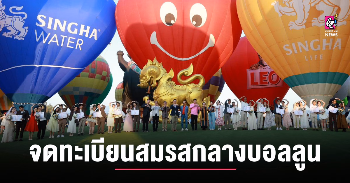 บรรยากาศวันแห่งความรัก 14 กุมภาพันธ์ 2569 เต็มไปด้วยความหวานและความโรแมนติก ที่ Singha Park Chiangrai อำเภอเมืองเชียงราย ภายในงาน “Singha Park International Balloon Fiesta 2026” ครั้งที่ 10 โดยจัดกิจกรรมไฮไลต์ “Balloon Love 2026” เปิดโอกาสให้คู่รักผู้โชคดีจำนวน 14 คู่ จดทะเบียนสมรสอย่างถูกต้องตามกฎหมาย พร้อมขึ้นบอลลูนลอยฟ้าบอกรักเหนือท้องฟ้าเชียงราย ท่ามกลางอากาศหนาวและทิวทัศน์ขุนเขาแบบ 360 องศา