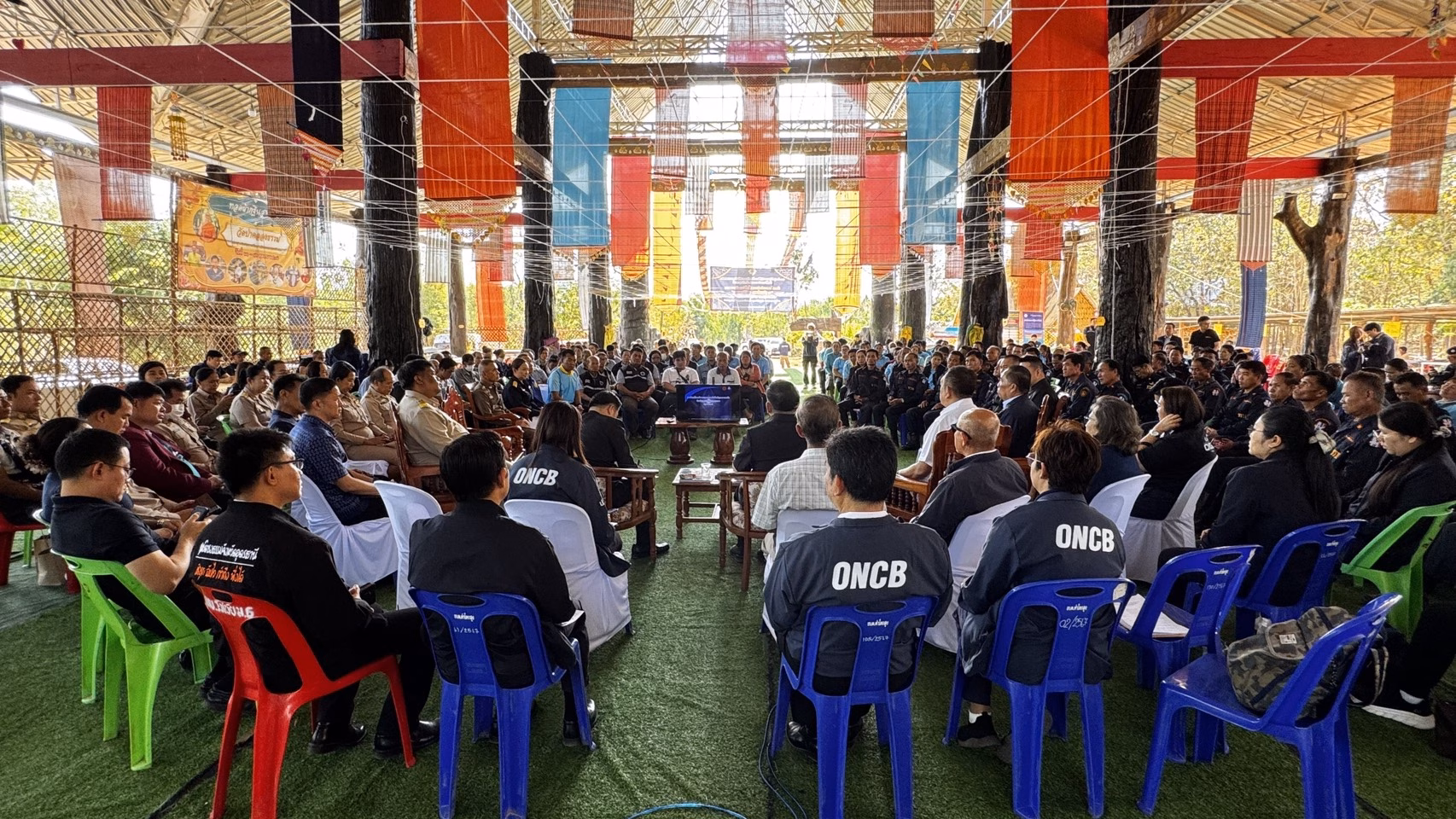เลขาธิการ ป.ป.ส. พร้อมคณะ ได้ร่วมเสวนาเวทีชาวบ้าน “คุยตรงๆ จับมือกัน ร่วมแก้ปัญหายาเสพติด” โดยพบปะพูดคุยกับคณะกรรมการกองทุนแม่ของแผ่นดิน กำนัน ผู้ใหญ่บ้าน แกนนำภาคประชาชน ชุดรักษาความปลอดภัยหมู่บ้าน ผู้ผ่านการบำบัดและครอบครัว รวมถึงวิทยากรกระบวนการ เพื่อรับฟังปัญหาและกำหนดแนวทางการดำเนินงานที่ครอบคลุมทุกมิติ