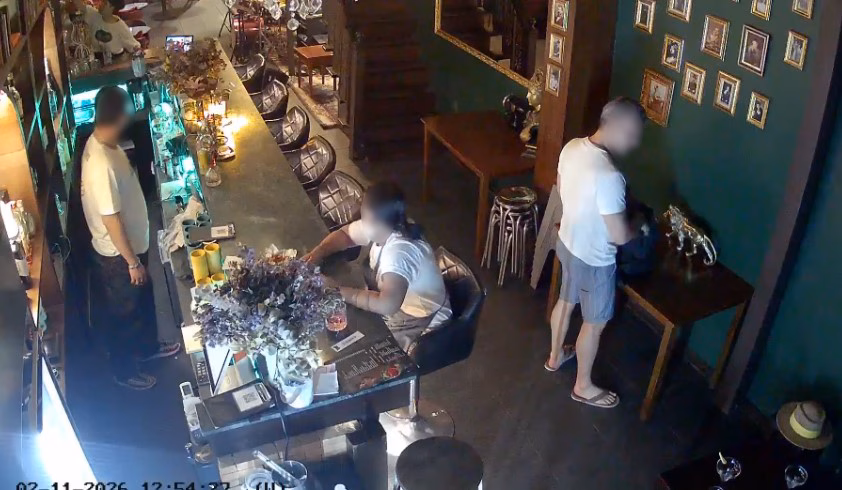 ภาพจากกล้องวงจรปิดเป็นช่วงเวลาร้านใกล้ปิด จะเห็นชายคนดังกล่าวไปยืนพิงโต๊ะวางรูปปั้นสิงโต ใช้มือจับสิงโตขยับมาใกล้กระเป๋า ระหว่างนั้นแฟนสาวลุกจากโต๊ะมาคุยกับพนักงานที่หน้าเคาเตอร์ ชายคนดังกล่าวจึงทำทีเดินมาคุยด้วยและยังเหลือบตามองดูกล้องวงจรปิด จากนั้นไม่นานได้เดินกลับไปที่โต๊ะ หยิบผ้าพันคอออกมาจากกระเป๋าใช้คลุมรูปปั้นสิงโต ก่อนจะหยิบใส่กระเป๋าอย่างรวดเร็วและเดินออกไปจากร้านคนเดียว เมื่อออกไปที่ประตูหน้าร้านได้หันกลับมาเรียกแฟนสาวให้รีบออกจากร้านไปด้วยกัน