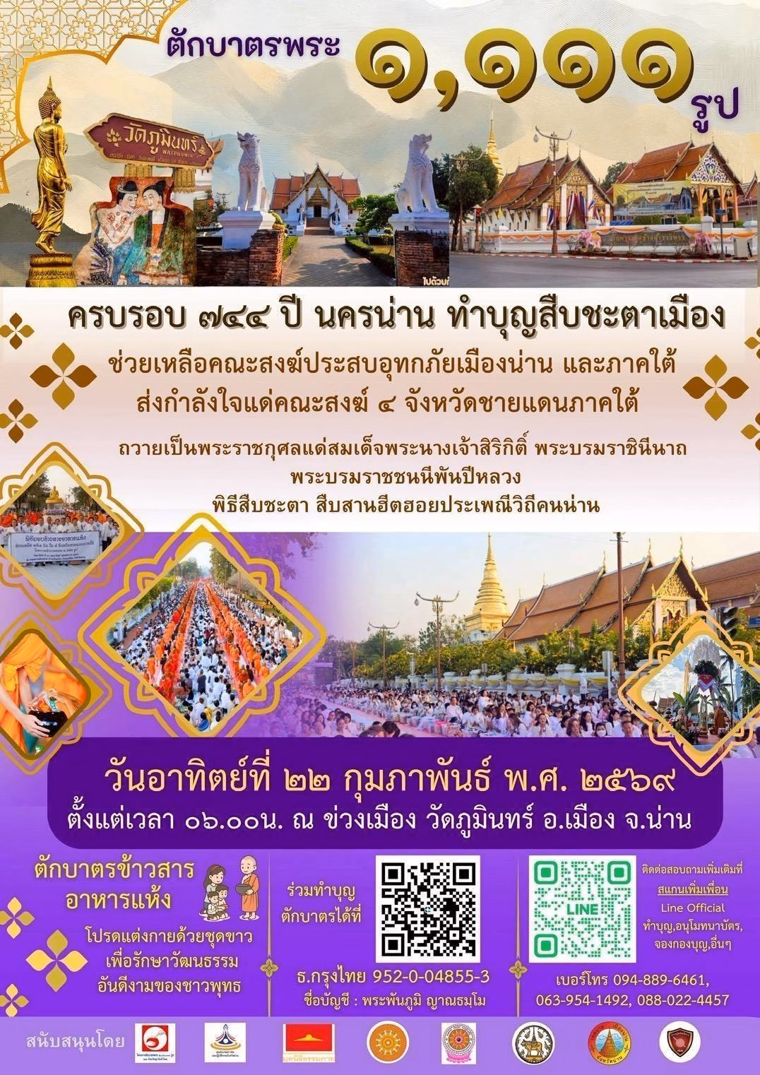 เทศบาลเมืองน่าน ขอเชิญพุทธศาสนิกชนชาวน่านและประชาชนทั่วไป ร่วมกิจกรรมทำบุญตักบาตรพระสงฆ์จำนวน 1,111 รูป เนื่องในโอกาสครบรอบ 744 ปี นครน่าน ภายใต้โครงการ “มาฆปูรณมีศรีนคร นครน่าน” วันที่ 22 กุมภาพันธ์ 2569 เวลา 06.00 น. ณ ถนนคนเดินข่วงเมืองน่าน ตำบลในเวียง อำเภอเมืองน่าน จังหวัดน่าน