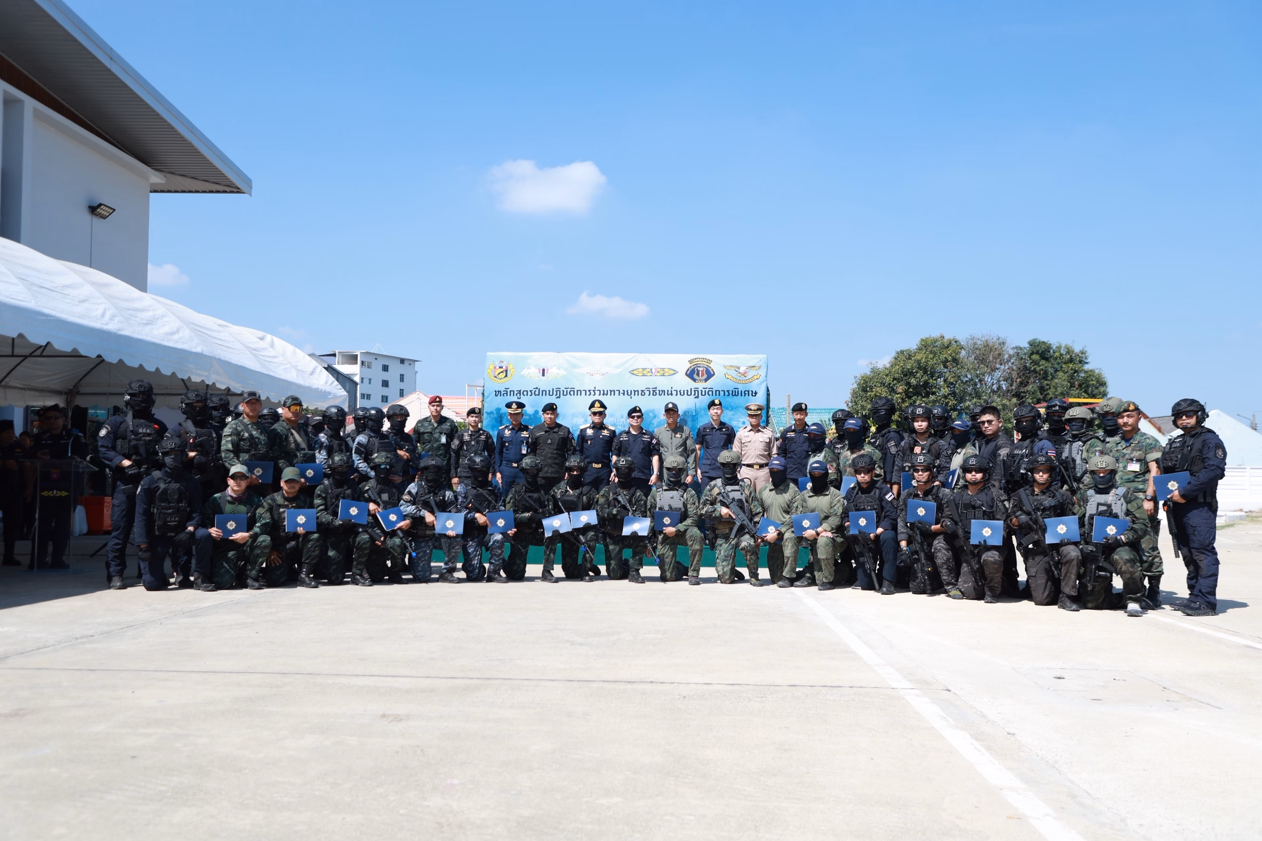 พ.ต.ต. สุริยา สิงหกมล เลขาธิการ ป.ป.ส. ให้เกียรติเป็นประธานในพิธีปิดการฝึกอบรมฯ พร้อมมอบวุฒิบัตรให้แก่ผู้สำเร็จการฝึกจำนวน 50 นาย โดยมีผู้บังคับบัญชาและผู้แทนจากหน่วยปฏิบัติการพิเศษระดับประเทศเข้าร่วมสังเกตการณ์และเป็นเกียรติในงาน ได้แก่ พล.ต.ต. ณรงค์ เอี่ยมสม ผู้บังคับการกองบินตำรวจ น.อ.อ. ไพศาล บุษบรรณ ผู้บังคับการกรมปฏิบัติการพิเศษ หน่วยบัญชาการอากาศโยธิน น.อ. โชคสถิต บุญถม รองผู้บังคับการกรมรบพิเศษ หน่วยบัญชาการสงครามพิเศษทางเรือ กองเรือยุทธการ พ.ต.อ. พิทักษ์ สุทธิกุล รองผู้บังคับการสายตรวจและปฏิบัติการพิเศษ พ.ต.อ. อาทิตย์ วงษ์จันนา ผู้กำกับการต่อต้านการก่อการร้าย (อรินทราช 26) พ.ต.อ. เจษฎา โสมมนัส ผู้กำกับการต่อต้านการก่อการร้าย (สยบริปูสะท้าน) และร.อ. บรรชา ช้างเขียว ผู้บังคับกองร้อยลาดตระเวนระยะไกลที่ 9 โดยภายในงานได้มีการจัดแสดงการสาธิตการฝึกอบรมฯ เพื่อโชว์ศักยภาพความพร้อมของชุดปฏิบัติการร่วม