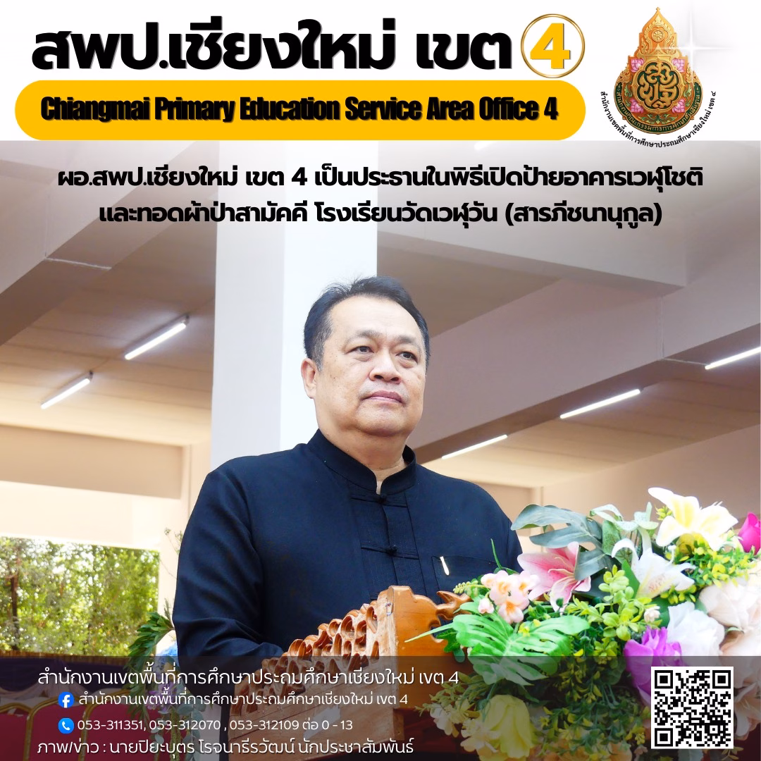 วันที่ 12 มีนาคม 2569 ดร.ชาญชิต ทัพหมี ผอ.สพป.เชียงใหม่ เขต 4 เป็นประธานในพิธีเปิดป้ายอาคารเวฬุโชติ และทอดผ้าป่าสามัคคี โรงเรียนวัดเวฬุวัน (สารภีชนานุกูล) โดยมีผู้บริหารสถานศึกษาในสังกัด ภาคีเครือข่าย คณะครู ผู้ปกครอง และนักเรียน เข้าร่วมพิธี ณ อาคารเวฬุโชติ โรงเรียนวัดเวฬุวัน (สารภีชนานุกูล) อ.สารภี จ.เชียงใหม่