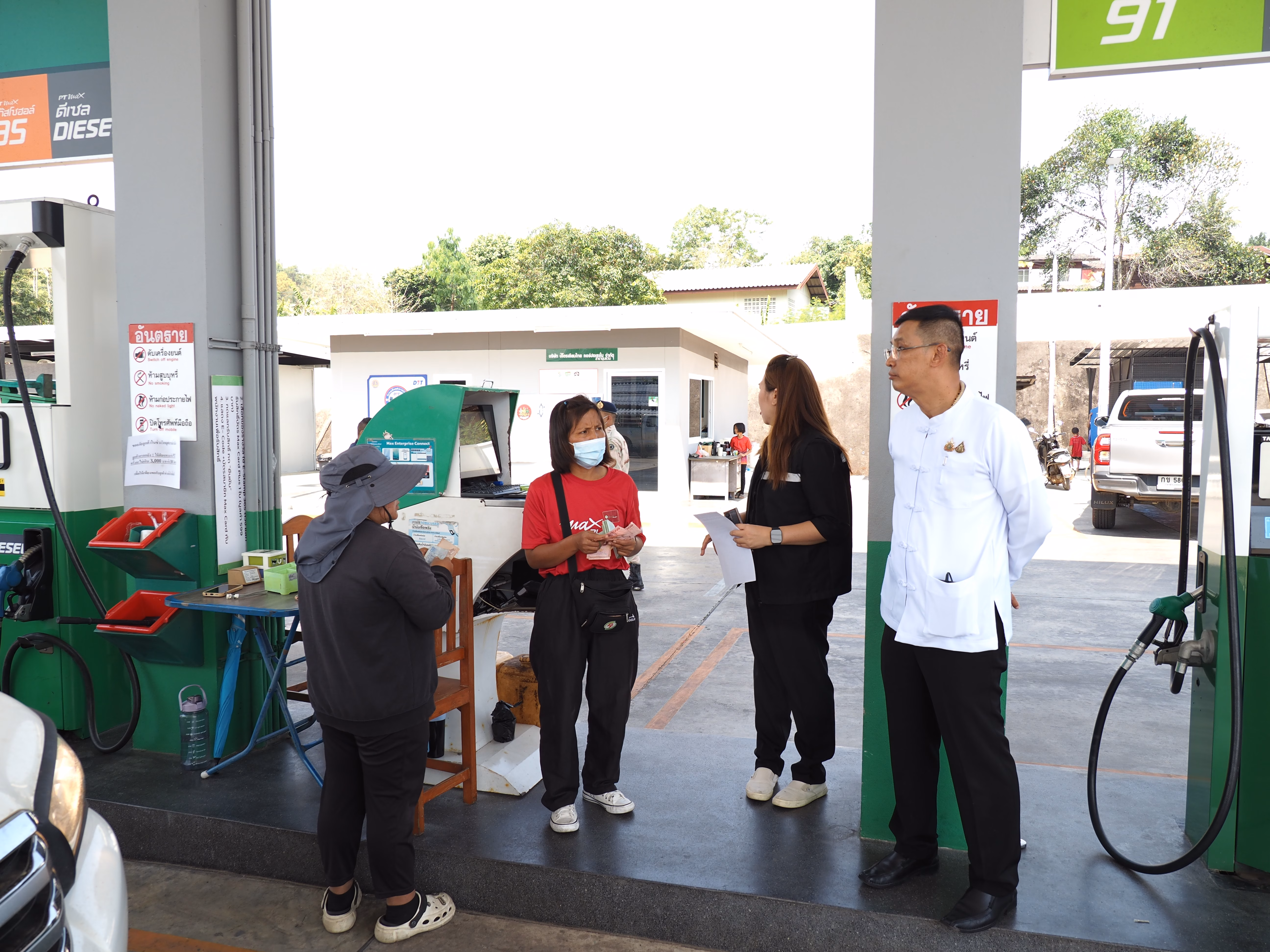 ทั้งนี้ จากการลงพื้นที่พบว่า มีรถมารอเติมน้ำมันที่ปั๊ม ปตท.สาขาขุนยวม เป็นจำนวนมาก ซึ่งทางปั๊มยังคงมีน้ำมันให้บริการตามปกติ แต่มีมาตรการให้รถยนต์ส่วนบุคคลที่เติมน้ำมันดีเซล สามารถเติมได้ 1,000 บาท รถบรรทุก เติมได้ 3,000 บาท ส่วนการนำถังมาเติมจำกัด 100 ลิตร สำหรับน้ำมันเบนซินและแก๊สโซฮอล์ สามารถเติมได้เติมถัง ส่วนการนำถังมาเติมจำกัด 400 ลิตร ด้านปั๊ม พีที สาขาขุนยวม พบว่าน้ำมันดีเซลหมด มีเพียงน้ำมันเบนซินและแก๊สโซฮอล์ให้บริการ โดยจะมีรถขนส่งน้ำมันเข้ามาเติมภายในเย็นวันนี้