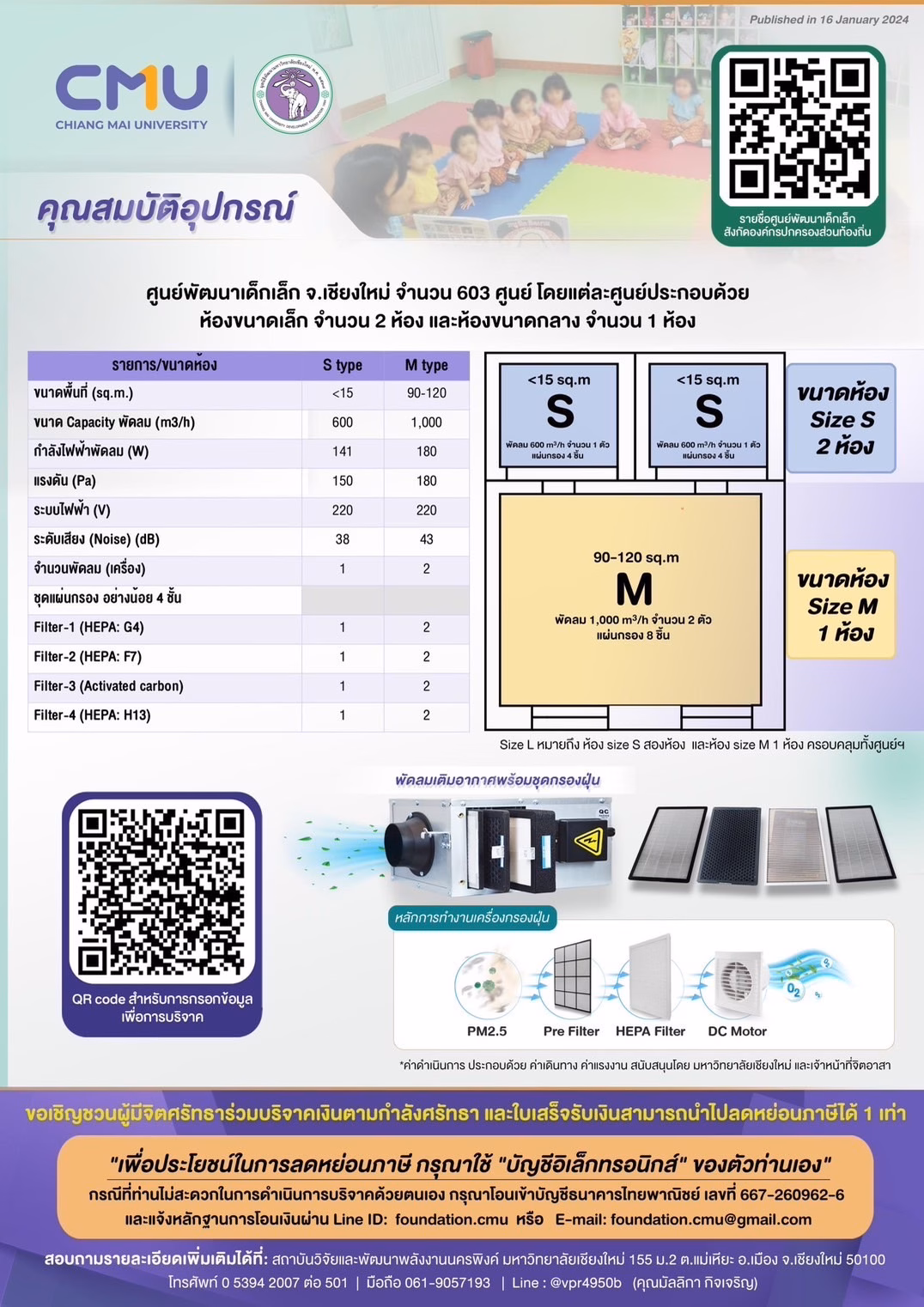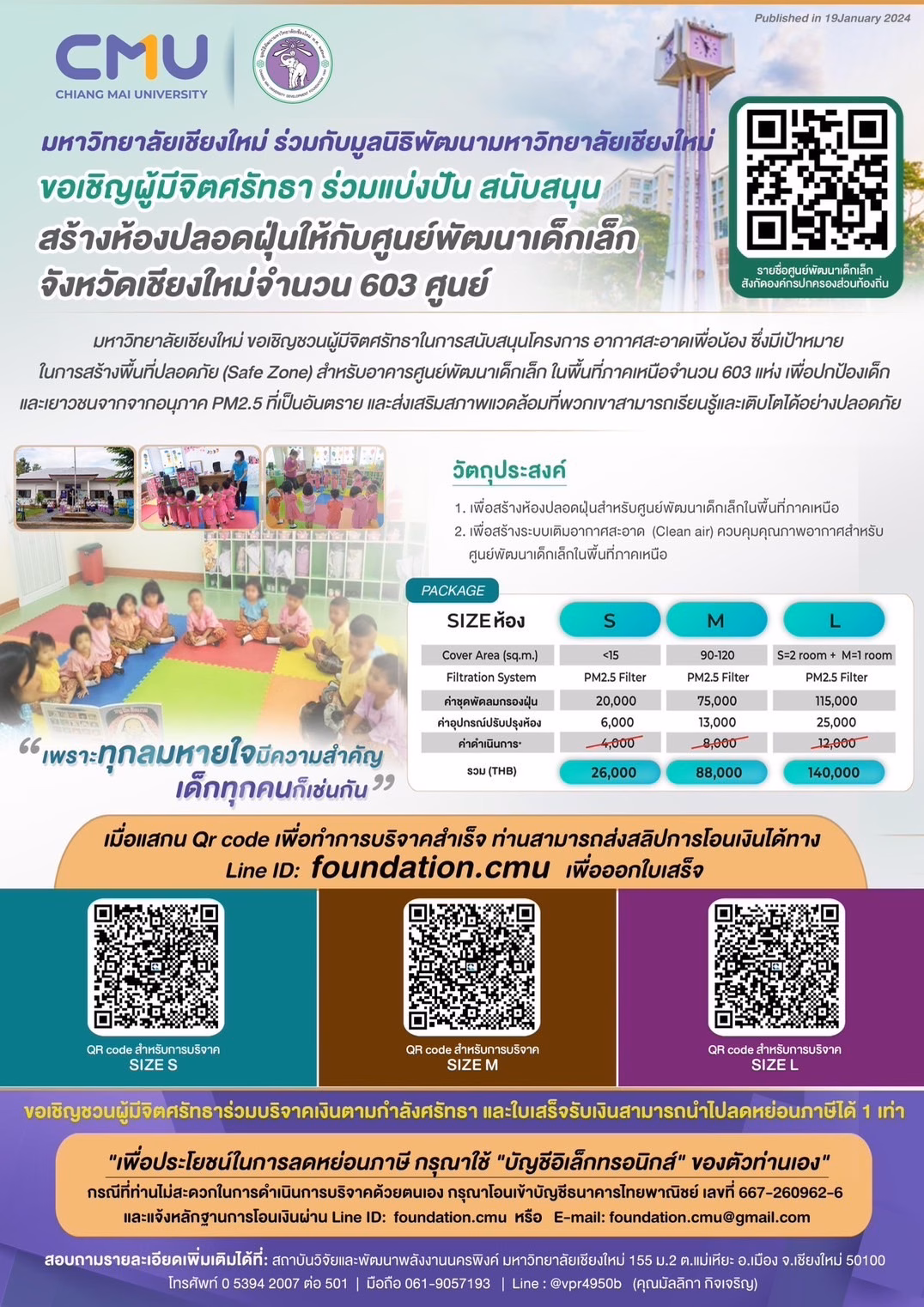 ขอเชิญทุกท่านร่วมเป็นส่วนหนึ่งในการสร้าง “ห้องปลอดฝุ่น” โดยร่วมบริจาคได้ตามจิตศรัทธา เพื่อมอบลมหายใจที่ปลอดภัยให้กับเด็กเล็กในภาคเหนือ เพราะทุกการให้ของท่าน คือการสร้างโอกาสให้เด็กไทยได้เติบโตอย่างแข็งแรงในอากาศที่สะอาด ได้ที่ https://donate.cmu.ac.th/home/project-home-details/48/7 ทั้งนี้ ทุกการบริจาคสามารถลดหย่อนภาษีได้ 1 เท่า