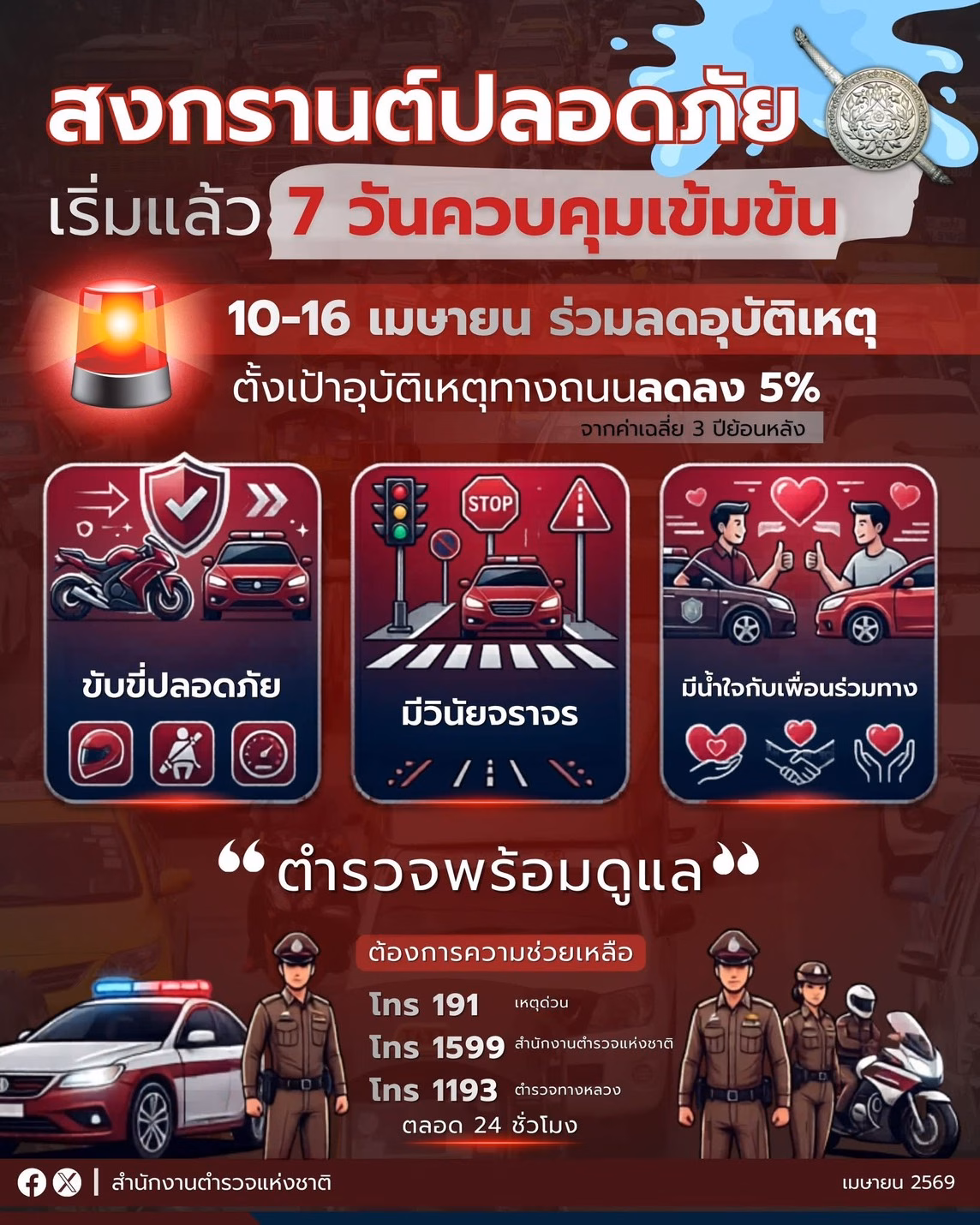 ทางสำนักงานตำรวจแห่ง ประกาศเริ่มแล้ว “7 วันอันตราย” คุมเข้มอุบัติเหตุบนถนนช่วงเทศกาลสงกรานต์ปี 2569 ตั้งเป้าลดลง 5 เปอร์เซนต์