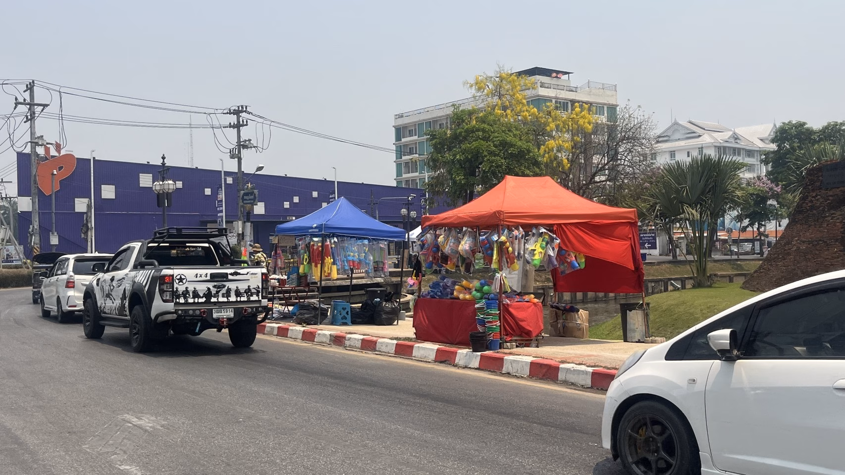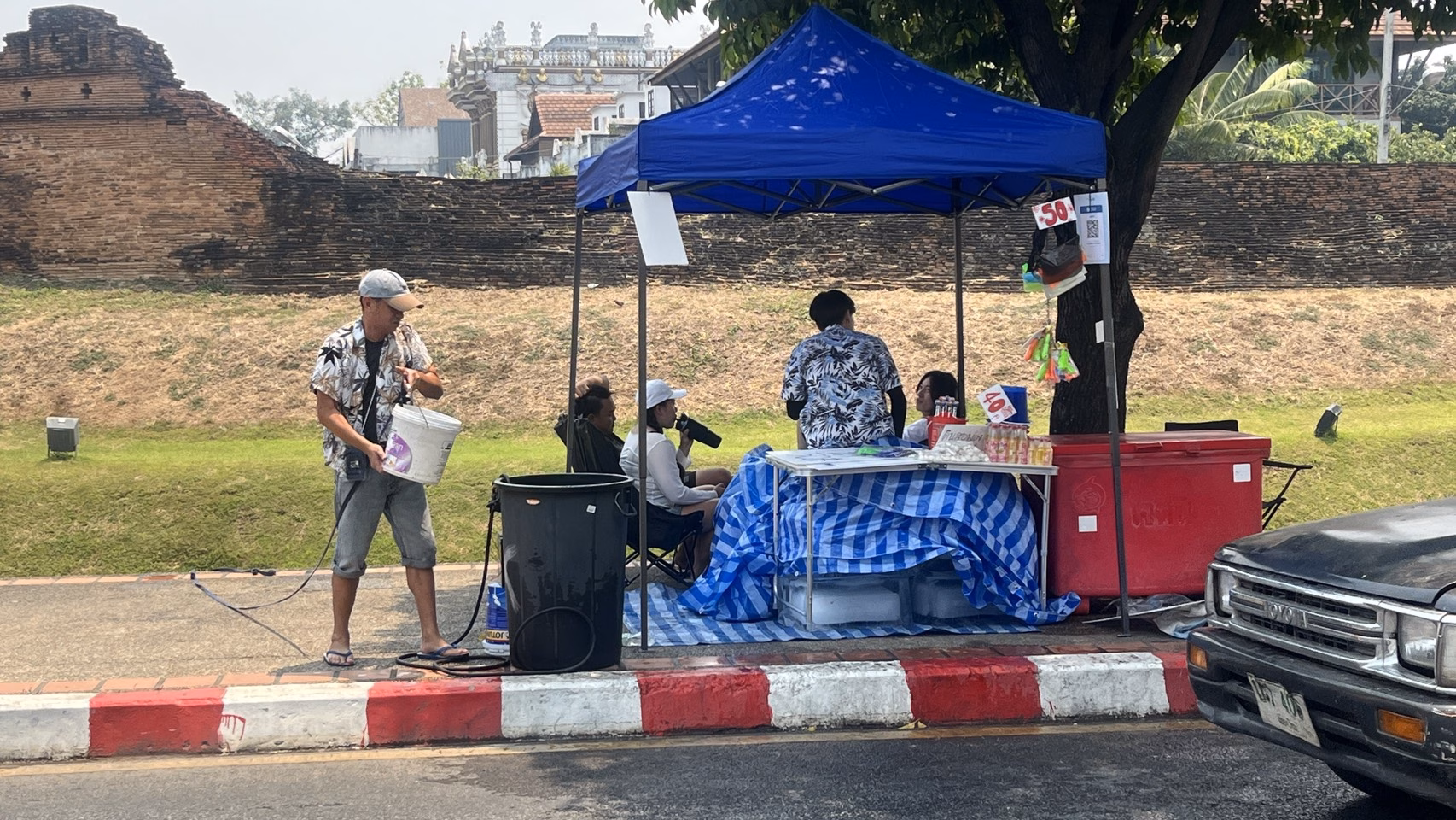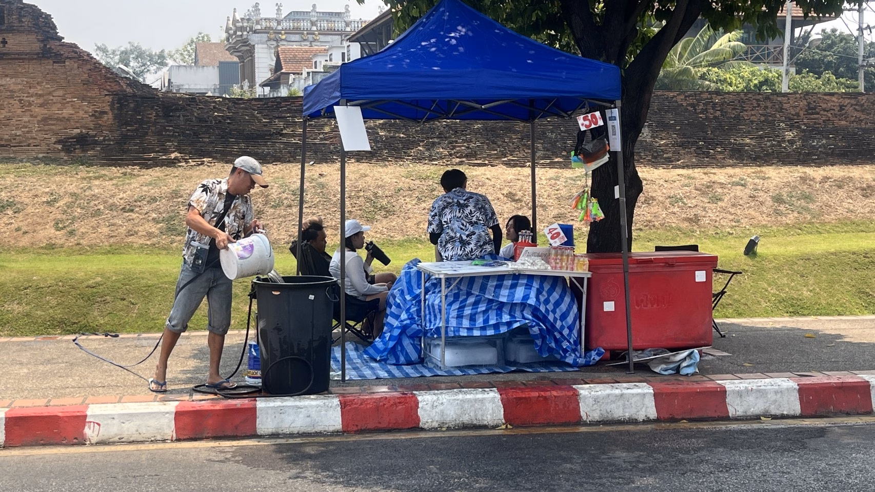 เมื่อเวลา 11.30 น.วันที่ 12 เม.ย.69 ผู้สื่อข่าวรายงานบรรยากาศคูเมืองเชียงใหม่ ด้านทิศตะวันตก หรือด้านประตูเชียงใหม่ที่ติดกับ รพ.สวนดอก ช่วงเช้าพบเห๋นพ่อค้าแม่ค้านำถังน้ำและอุปกรณ์เล่นน้ำมาขาย มีปืนฉีดน้ำ และถังน้ำขนาดเล็กและขนาดใหญ่ รวมทั้วร้านค้าขายอาหารก็เปิดบริการกันแล้วจำนวนไม่กี่ร้าน แต่ยังไม่พบว่าใครเล่นน้ำ หรือสาดน้ำกันเลย ร้านค้าก็มีจำนวนน้อย บรรยากาศโดยรวมยังเงียบเหงาอยู่