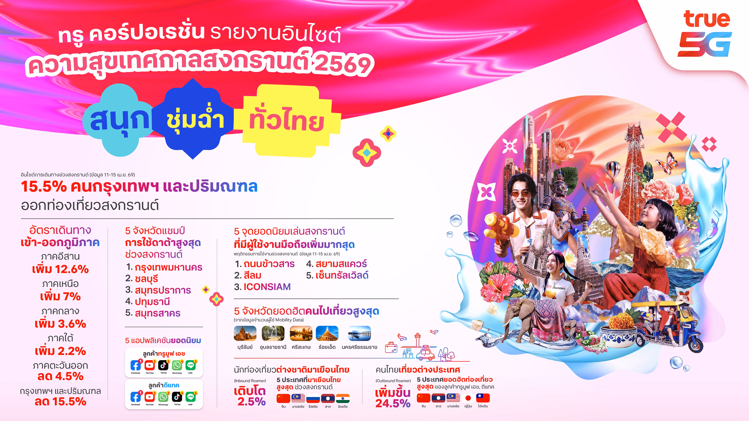 16 เมษายน 2569 – ทรู คอร์ปอเรชั่น เผยอินไซต์ “ความสุขเทศกาลสงกรานต์ 2569” ผ่านการวิเคราะห์ข้อมูล “Mobility Data” จากโครงข่ายอัจฉริยะที่ขับเคลื่อนด้วย AI สะท้อนพฤติกรรมการเดินทางและการใช้งานดิจิทัลของผู้บริโภคแบบเรียลไทม์ พบว่าเทศกาลปีนี้มีการเดินทางกระจายตัวมากขึ้นทั่วประเทศ โดยเฉพาะภูมิภาคอีสานที่เติบโตสูงสุด ขณะที่นักท่องเที่ยวต่างชาติยังคงเพิ่มขึ้นต่อเนื่อง โดยเฉพาะนักท่องเที่ยวจีนที่ครองอันดับหนึ่ง