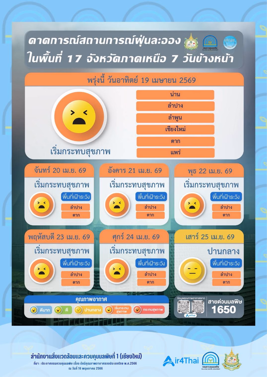 📢 สรุปสถานการณ์ฝุ่น PM2.5 เฉลี่ย 24 ชั่วโมง ณ เวลา 07.00 น. ประจำวันที่ 19 เมษายน 2569 ในพื้นที่รับผิดชอบของสำนักงานสิ่งแวดล้อมและควบคุมมลพิษที่ 1 (เชียงใหม่ เชียงราย ลำพูน แม่ฮ่องสอน)