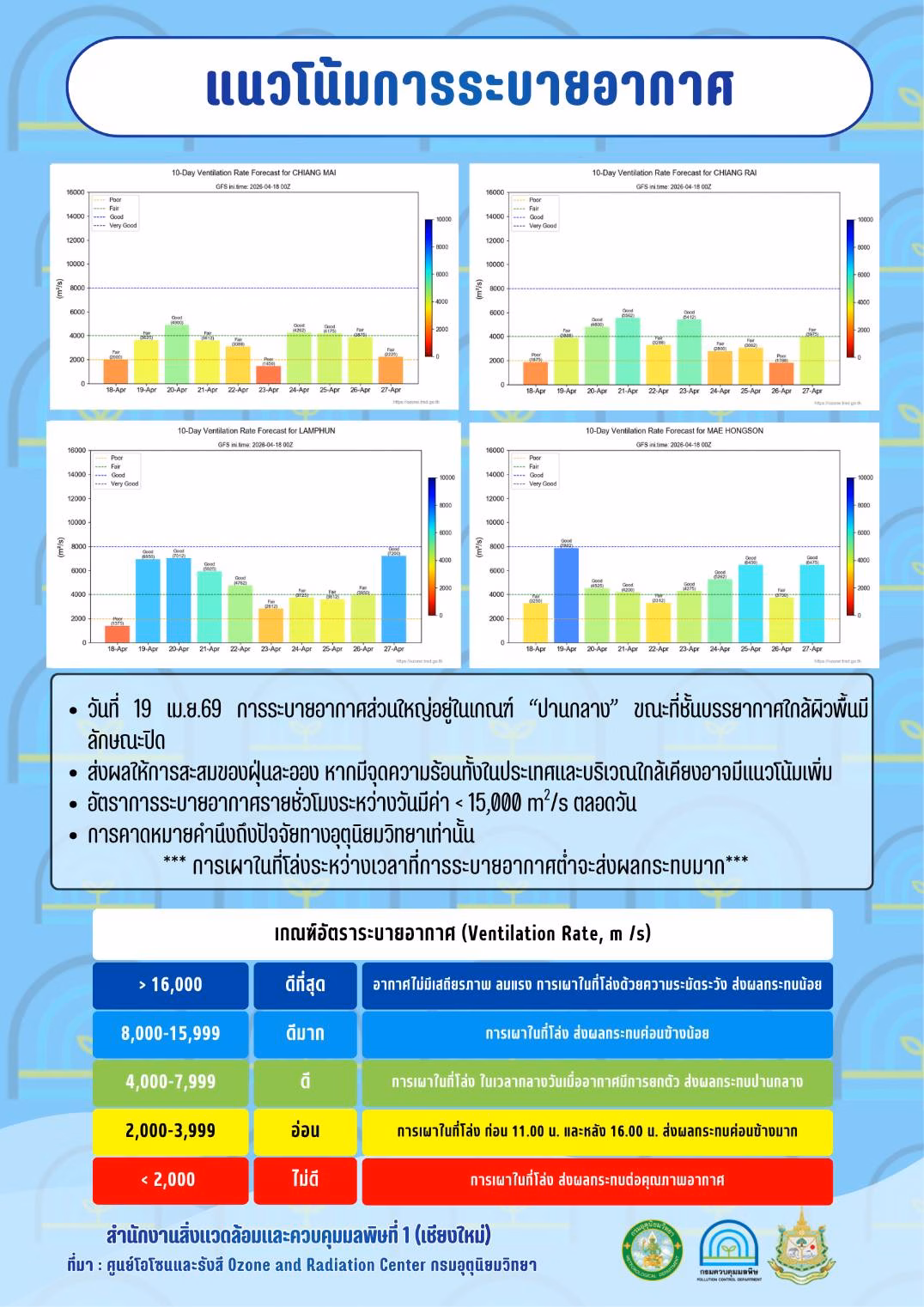 📈☁️👉 คาดการณ์การสะสมของฝุ่นละอองภาพรวมภาคเหนือวันพรุ่งนี้ คุณภาพอยู่ในระดับ 🟠 “เริ่มมีผลกระทบต่อสุขภาพ” จากคาดการณ์การ ระบายอากาศ วันที่ 19-27 เม.ย.การระบายอากาศอยู่ในเกณฑ์ “ปานกลาง” การระบายอากาศเริ่มดีขึ้น อาจส่งผลให้ความเข้มข้นของฝุ่นละอองมีแนวโน้มลดลง อย่างไรก็ตาม หากมีปัจจัยอื่นที่มีน้ำหนักมากกว่า เช่น จุดความร้อนทั้งในประเทศและบริเวณใกล้เคียงอาจส่งผลให้ความเข้มข้นของฝุ่นละอองมีแนวโน้มเพิ่มขึ้นได้ อัตราการระบายอากาศรายชั่วโมงระหว่างวันมีค่า < 15,000 m2/s ตลอดวัน