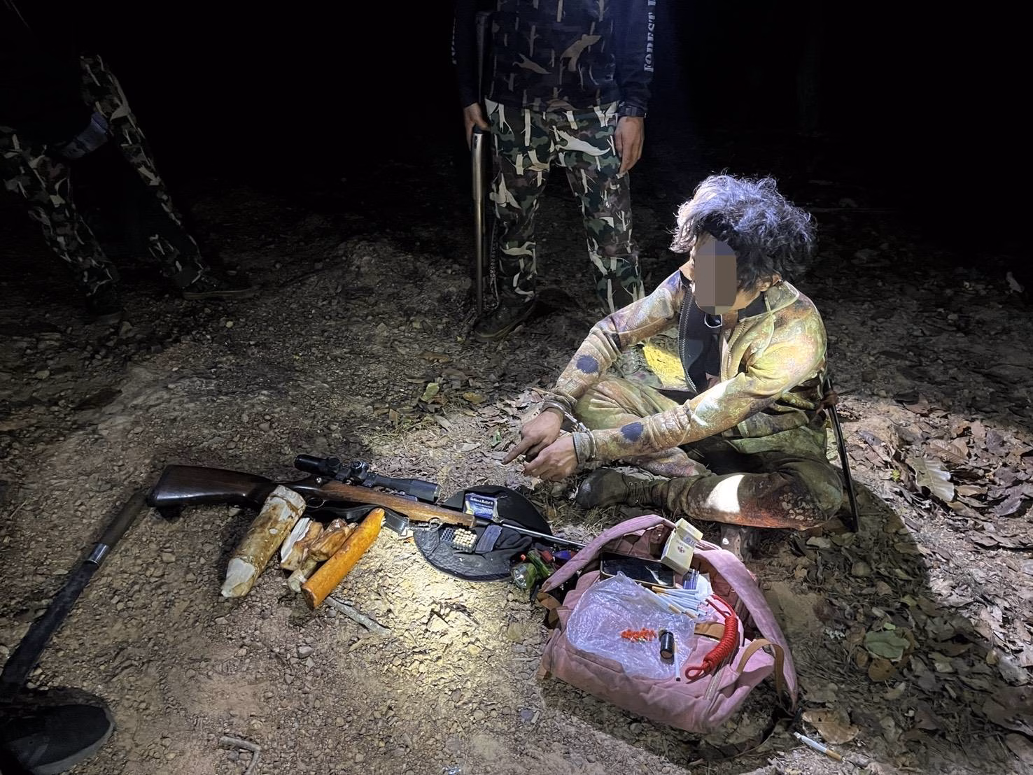 ต่อมาเวลาประมาณ 01.30 น. คณะพนักงานเจ้าหน้าที่ตรวจพบแสงไฟรถจักรยานยนต์ จำนวน 2 คัน ห่างจากจุดที่เจ้าหน้าที่กำลังเดินลาดตระเวนอยู่ระยะห่างประมาณ 900 เมตร กำลังขับขี่มาตามถนนลำลอง ในพื้นที่ป่าเขตอุทยานแห่งชาติผาแดง มุ่งหน้ากลับเข้าไปยังหมู่บ้านแกน้อย ซึ่งจุดที่พบแสงไฟรถจักรยานยนต์นั้น ใกล้เคียงกับบริเวณที่ได้รับแจ้งจุดความร้อน (Hotspot) เมื่อวันที่ 19 เมษายน 2569 จำนวน 2 จุด ช่วงเวลา 02.18 น. ระยะห่างประมาณ 400 เมตร เจ้าหน้าที่จึงได้กระจายกำลังดักซุ่มเพื่อรอทำการตรวจสอบ บริเวณพิกัด 47 Q 477306 E 2173154 N เมื่อรถจักรยานยนต์ทั้ง 2 คันขับขี่มาใกล้ถึงบริเวณที่เจ้าหน้าที่ดักซุ่มอยู่ พบว่าเป็นบุคคลเพศชาย จำนวน 2 คน สะพายอาวุธปืนคนละ 1 กระบอก คาดว่าชายทั้งสองอาจสังเกตุเห็นเจ้าหน้าที่ที่กำลังดักซุ่มอยู่ เกิดไหวตัว ได้เลี้ยวรถจักรยานยนต์ขับขี่หลบหนีกลับเข้าไปในพื้นที่ป่าอย่างรวดเร็ว เจ้าหน้าที่พยายามวิ่งไล่ตามไป กระทั่งสามารถจับกุมผู้ต้องหาได้ 1 ราย พร้อมรถจักรยานยนต์ จำนวน 1 คัน ส่วนผู้ต้องหาอีก 1 ราย สามารถหนีการจับกุมไปได้