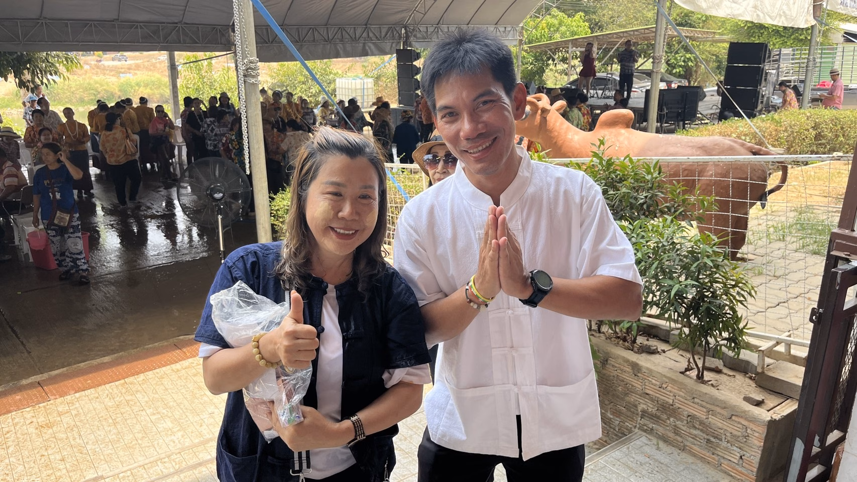 ส่วนวันก่อน (19 เม.ย.) ที่ลานหน้าบ้านริมน้ำเมย ท่า 23 (ชเวโก๊กโก่) นายภาคภูมิ บูลย์ประมุข “สส.ปั้น” สมาชิกสภาผู้แทนราษฎรจังหวัดตาก พรรคกล้าธรรม เป็นประธานดำหัวพ่อเลี้ยงคำ จันทร์บุญ นักบุญสองแผ่นดิน (เจ้าของบ้านริมน้ำ) โดยมี ร.ต.ธงชัย มณีศร หรือ “หมวดธง” สมาชิกสภาองค์การบริหารส่วนจังหวัด (อบจ.) จ.ตาก เขต 3 เจ้าของท่า 23 ให้การต้อนรับ สส.ปั้น พร้อมต้อนรับคณะแขกผู้ใหญ่ผู้มีเกียรติทุกๆท่านที่มาร่วมงานรดน้ำดำหัวดังกล่าว