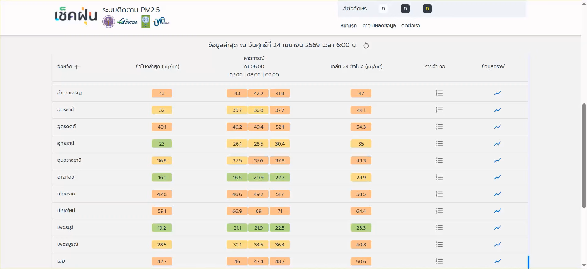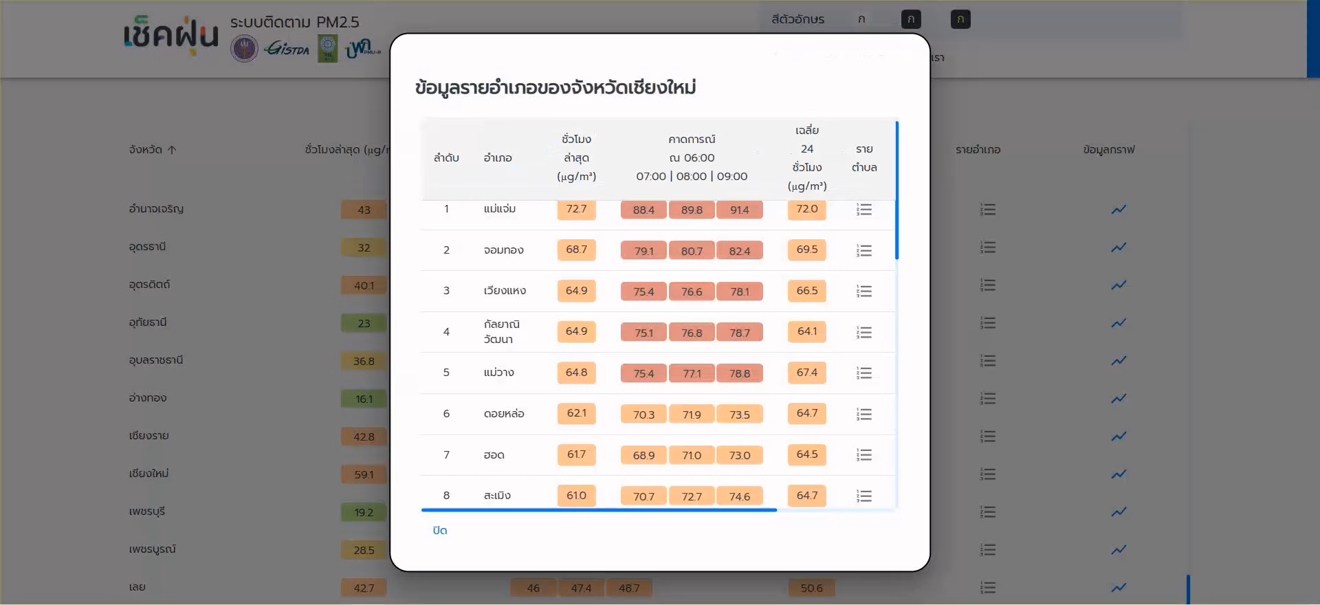 ส่วนตรวจสอบข้อมูลคุณภาพอากาศ จากสำนักงานพัฒนาเทคโนโลยีอวกาศและภูมิสารสนเทศ (องค์การมหาชน) ผ่านทางแอพพลิเคชั่น เช็คฝุ่นระบบติดตาม PM2.5 จำนวน 25 อำเภอของจังหวัดเชียงใหม่ ช่วงเวลา 06.00 น.ค่าฝุ่นละอองขนาดเล็ก PM 2.5 ขยับบางเล็กน้อย ยังคงจากเกินค่ามาตรฐาน 37.5 ไมโครกรัมต่อลูกบาศก์เมตร ทั้งจังหวัดเชียงใหม่ เป็นสีส้ม 25 อำเภอ มีค่าตั้งแต่ 46.0-72.7 ไมโครกรัมต่อลูกบาศก์เมตร พบมากที่สุดอำเภอแม่แจ่ม วัดได้ 72.4 ไมโครกรัมต่อลูกบาศก์เมตร ,อำเภอจอมทอง วัดได้ 68.7 ไมโครกรัมต่อลูกบาศก์เมตร น้อยสุดอำเภอแม่อาย วัดได้ 46.0 ไมโครกรัมต่อลูกบาศก์เมตร ส่วนที่อำเภอเมืองเชียงใหม่ วัดได้ 56.9 ไมโครกรัมต่อลูกบาศก์เมตร
