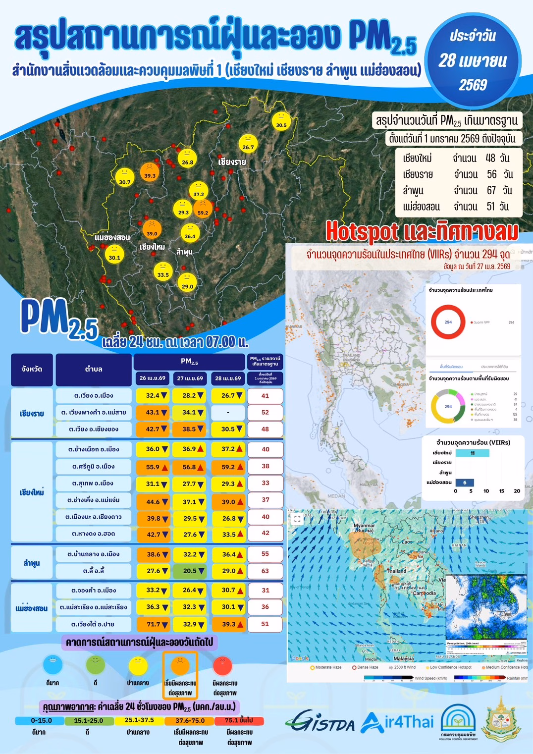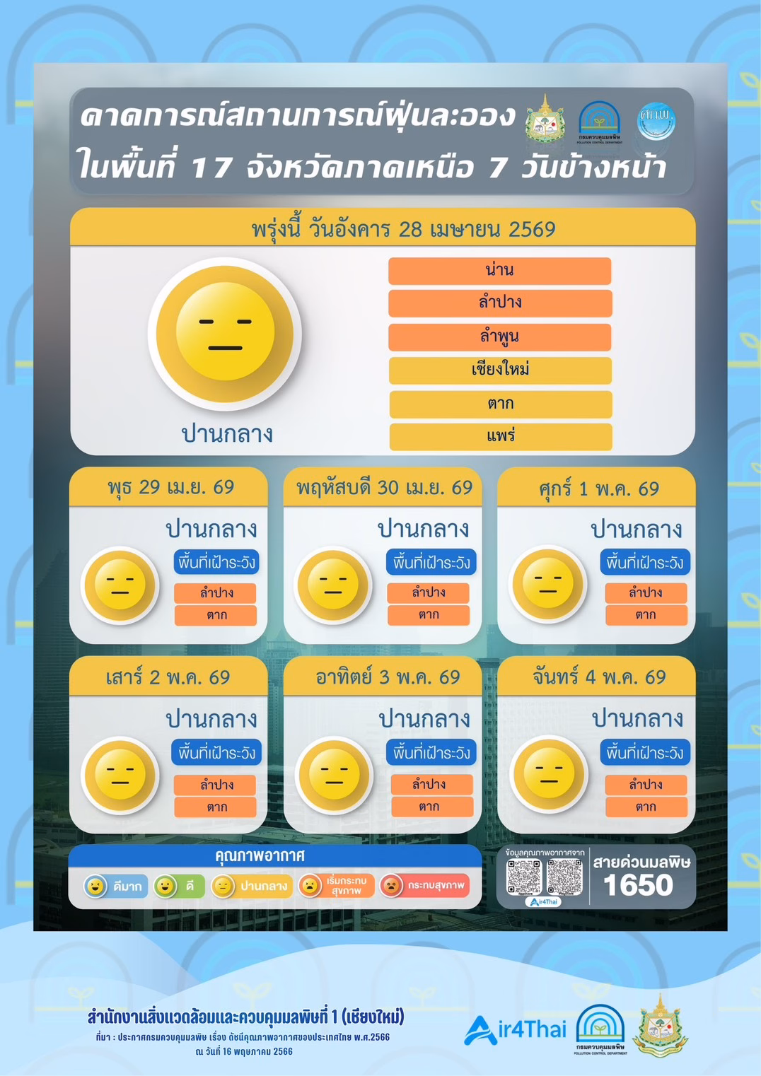 📢 สรุปสถานการณ์ฝุ่น PM2.5 เฉลี่ย 24 ชั่วโมง ณ เวลา 07.00 น. ประจำวันที่ 28 เมษายน 2569 ในพื้นที่รับผิดชอบของสำนักงานสิ่งแวดล้อมและควบคุมมลพิษที่ 1 (เชียงใหม่ เชียงราย ลำพูน แม่ฮ่องสอน)