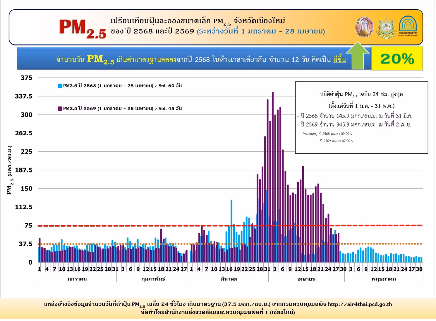 🌐ค่ามาตรฐาน PM2.5 เฉลี่ย 24 ชั่วโมง ไม่เกิน 37.5 มคก./ลบ.ม.