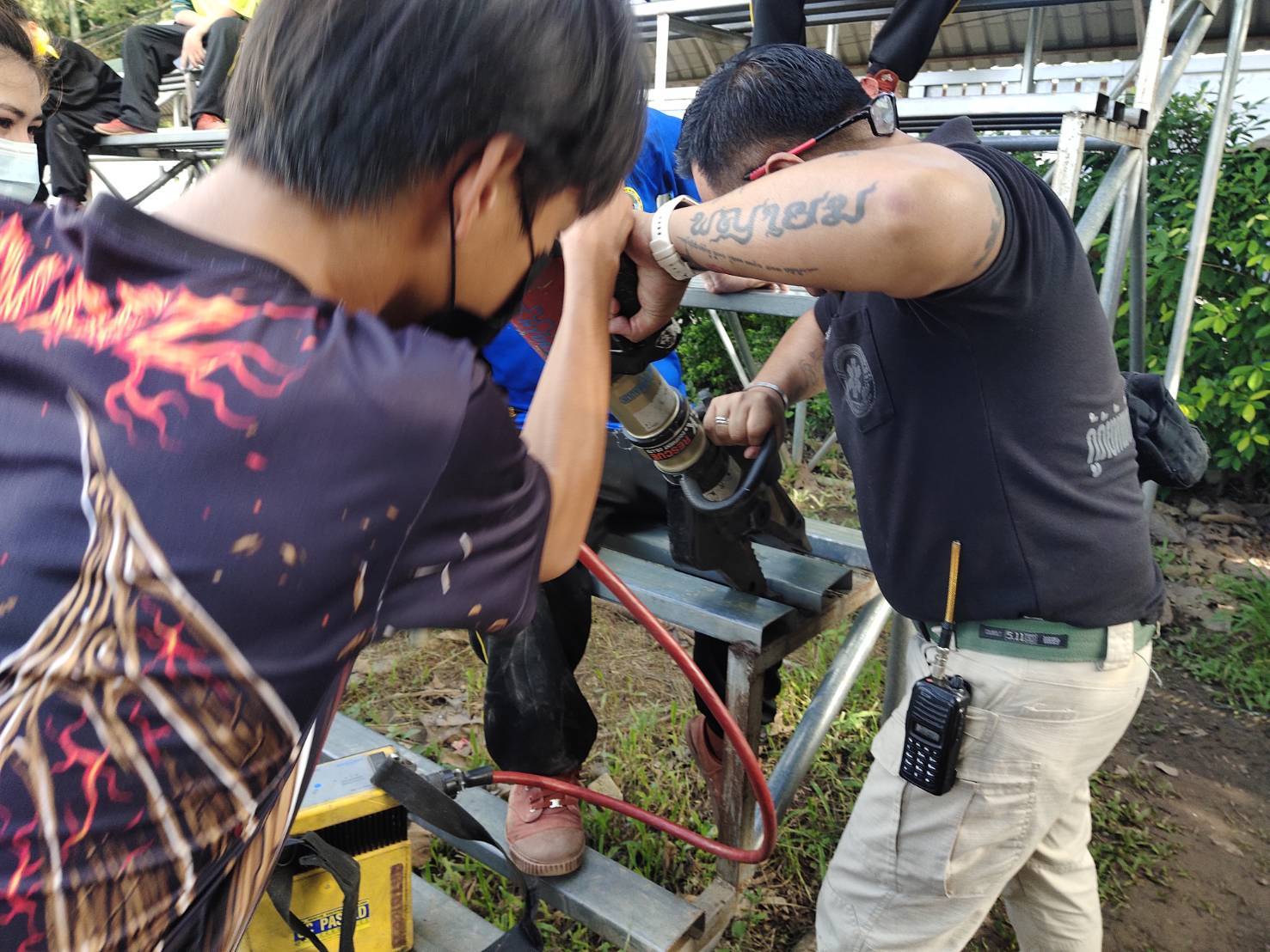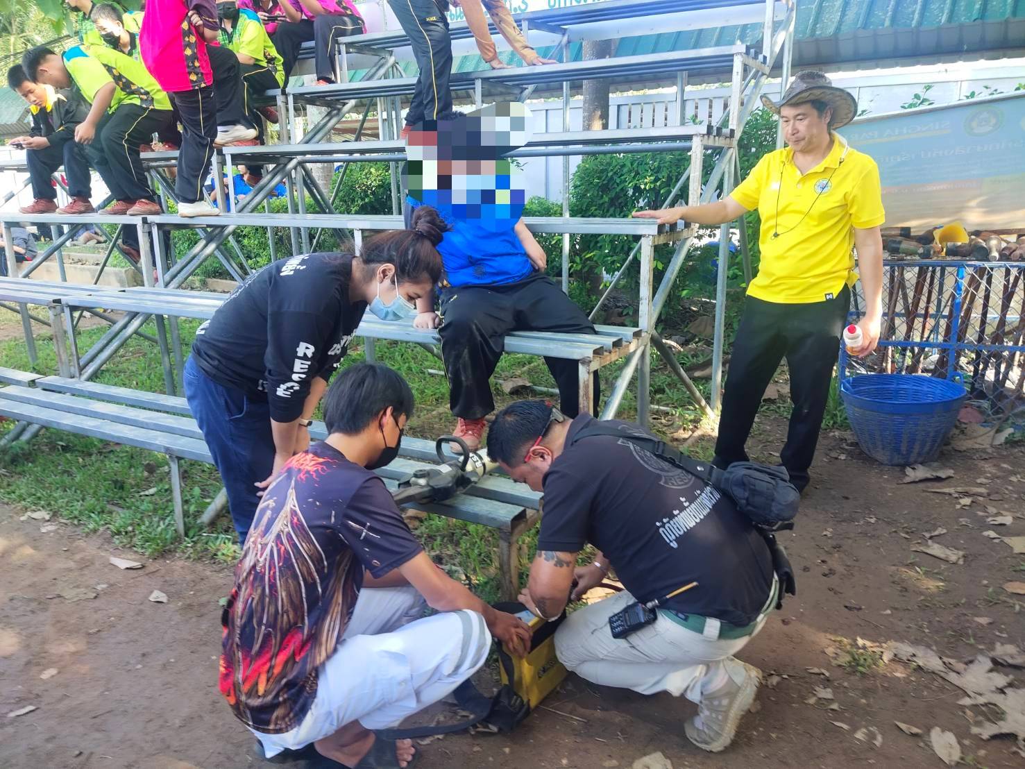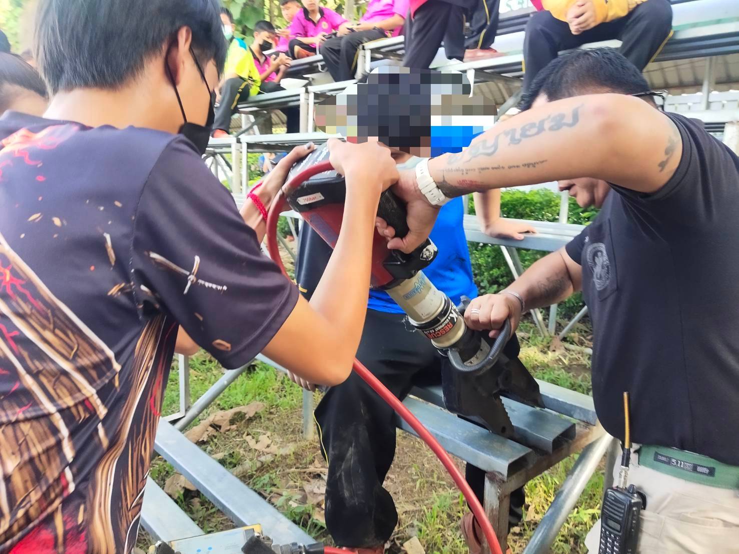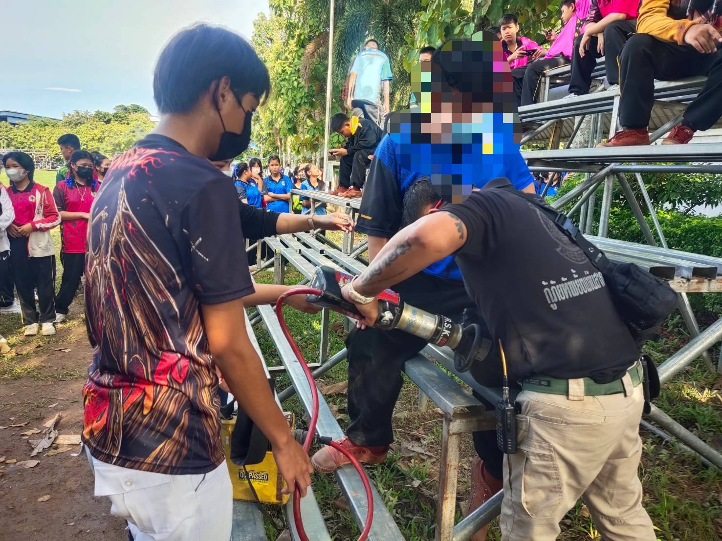 เด็กนักเรียนชายเหยียบพลาด ขาติดร่องเหล็กบนอัฒจันทร์เชียร์กีฬา กู้ภัยต้องนำอุปกรณ์ตัดถ่างเข้าช่วยเหลือ