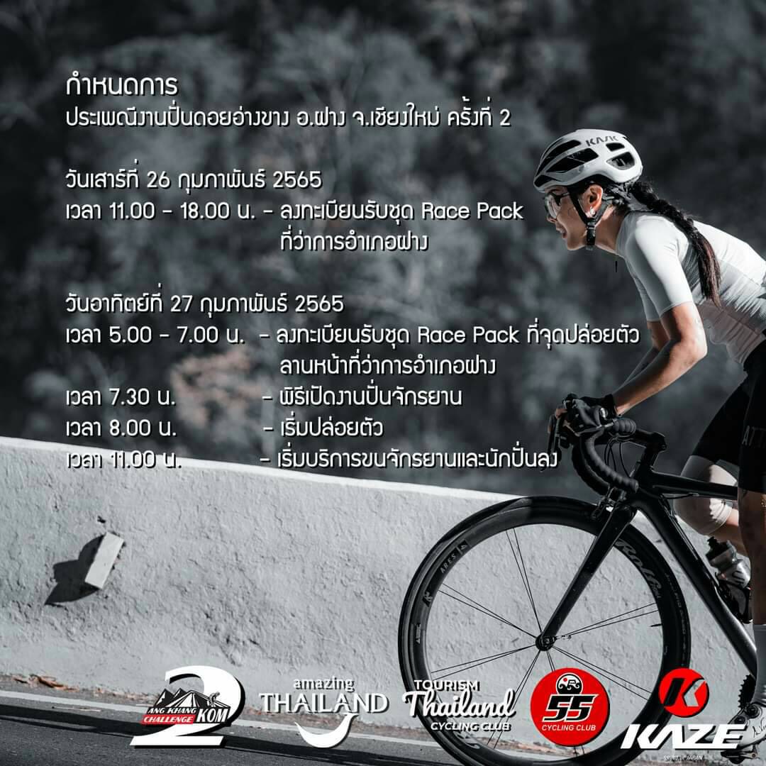 วันอาทิตย์ที่ 27 กุมภาพันธ์ 2565 เวลา 5.00 – 7.00 – ลงทะเบียนรับชุด Race Pack ที่จุดปล่อยตัว ลานหน้าที่ว่าการอำเภอฝาง เวลา 7.30 – พิธีเปิดงานปั่นจักรยาน เวลา 8.00 – เริ่มปล่อยตัว เวลา 11.00 – เริ่มบริการขนจักรยานและนักปั่นลงเพื่อความปลอดภัยของนักปั่น ไม่อนุญาตให้ปั่นลงจากดอยอ่างขางโดยเด็ดขาด โดยผู้จัดได้เตรียมรถสำหรับจักรยานและนักปั่นลงจากดอยอ่างขาง