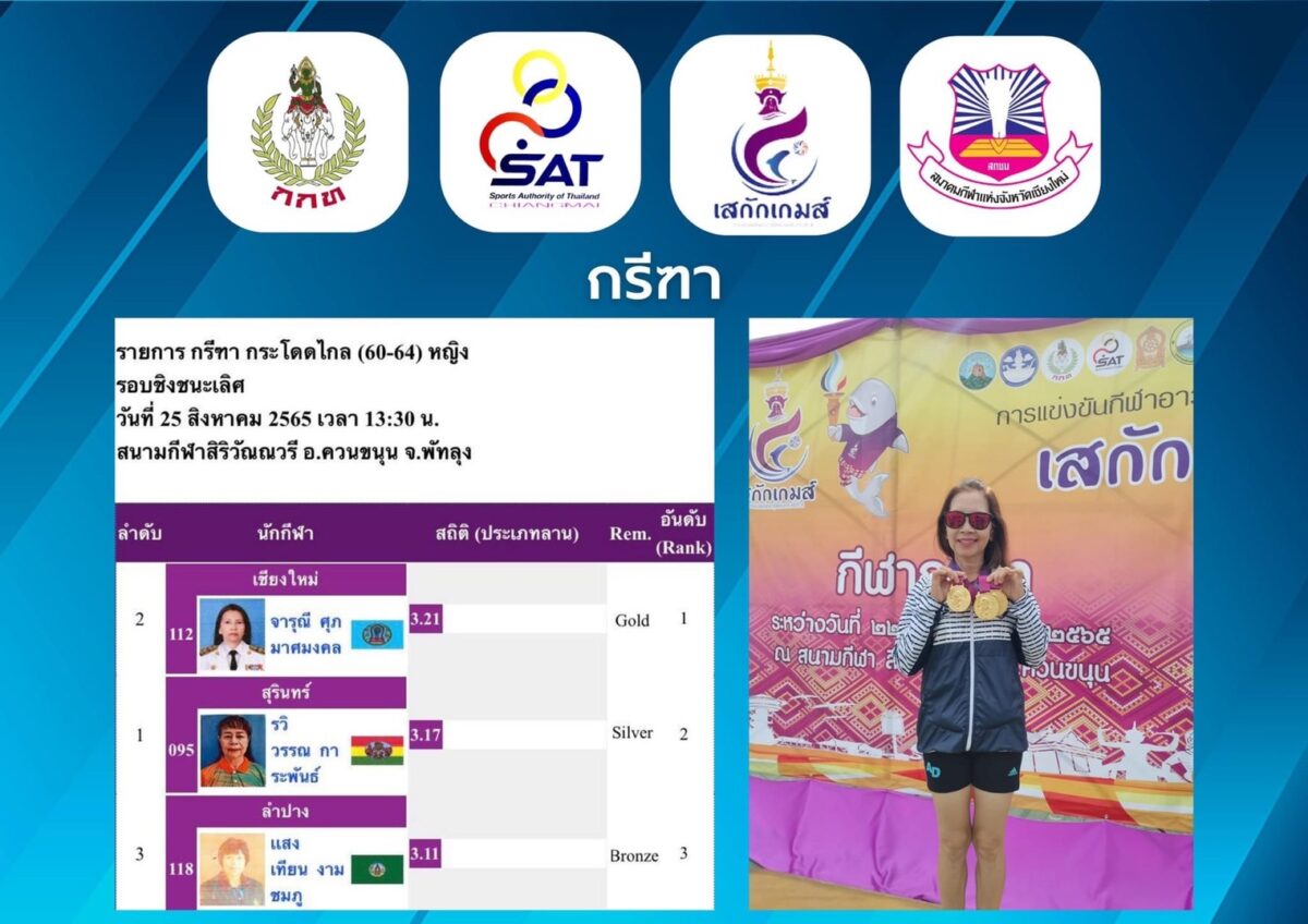 เขย่งก้าวกระโดด (45-49) หญิง สาริณี คุณยศยิ่ง เขย่งก้าวกระโดด (55-59) หญิง ,เขย่งก้าวกระโดด (60-64) หญิง .จารุณี ศุภมาศมงคล,. พุ่งแหลน (75-79) ชาย สมศักดิ์ สร้อยอินทร์ กรีฑาพุ่งแหลน (80-84) ชาย