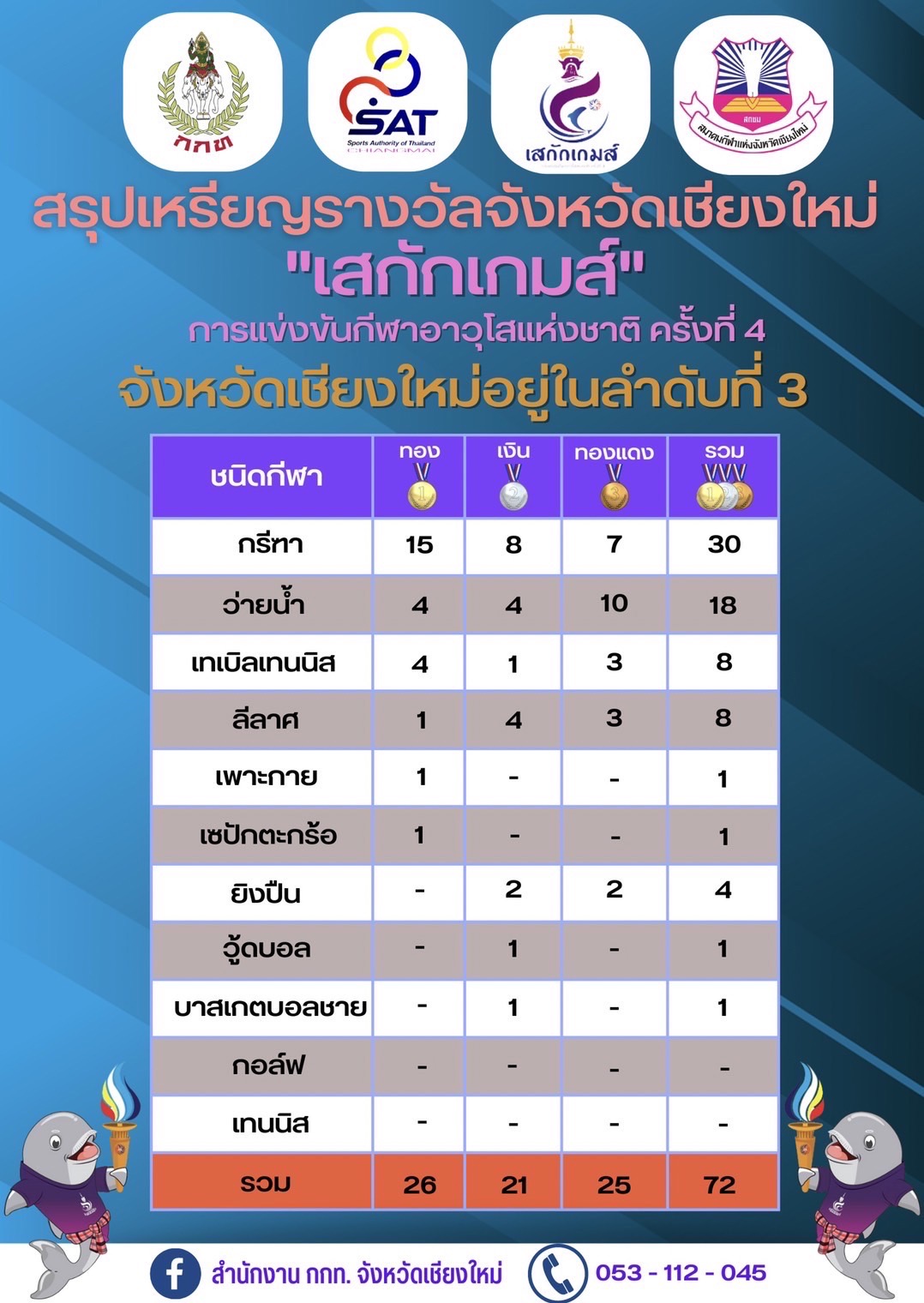 - 25 เหรียญทองแดง รวมเป็น 72 เหรียญ ขอขอบคุณนักกีฬา ผู้ฝึกสอน เจ้าหน้าที่ และผู้มีส่วนเกี่ยวข้องทุกท่าน ที่ช่วยกันร่วมแรงร่วมใจ ทุ่มเททั้งกำลังกายกำลังใจ เพื่อจังหวัดเชียงใหม่ในการแข่งขัน กีฬาอาวุโสแห่งชาติ ครั้งที่ 4 เสกักเกมส์ ที่พัทลุง