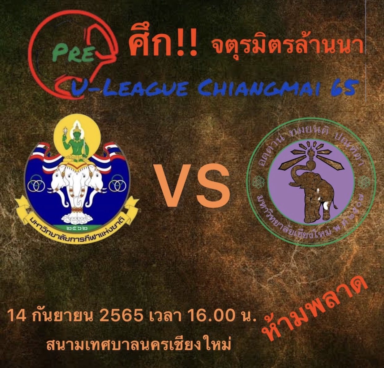รองหมู ดร.จารุวัฒน์ สัตยานุรักษ์ รองอธิการบดี มกช.เชียงใหม่ ไฟเขียวให้ มกช.เชียงใหม่ แม่งานจัด ฟุตบอลจตุรมิตร 4 ทีมร่วม ก่อนเปิดฉากดวล ยูลีก 11 ในเดือนพฤศจิกายน ทีมฟุตบอลอุดมศึกษา 4 ทีมใน เชียงใหม่ นัดดวลลูกหนัง จตุรมิตร ปรี ยูลีก เชียงใหม่ ในวันที่ 14 กันยายน 2565 เพื่อเตรียมความพร้อมในการแข่งขัน ฟุตบอลยูลีก เชียงใหม่ ประจำปี 2565 ที่จะจัดการแข่งขัน ในเดือน พฤศจิกายน 2565 มีการแข่งขันฟุตบอล และวอลเลย์บอล