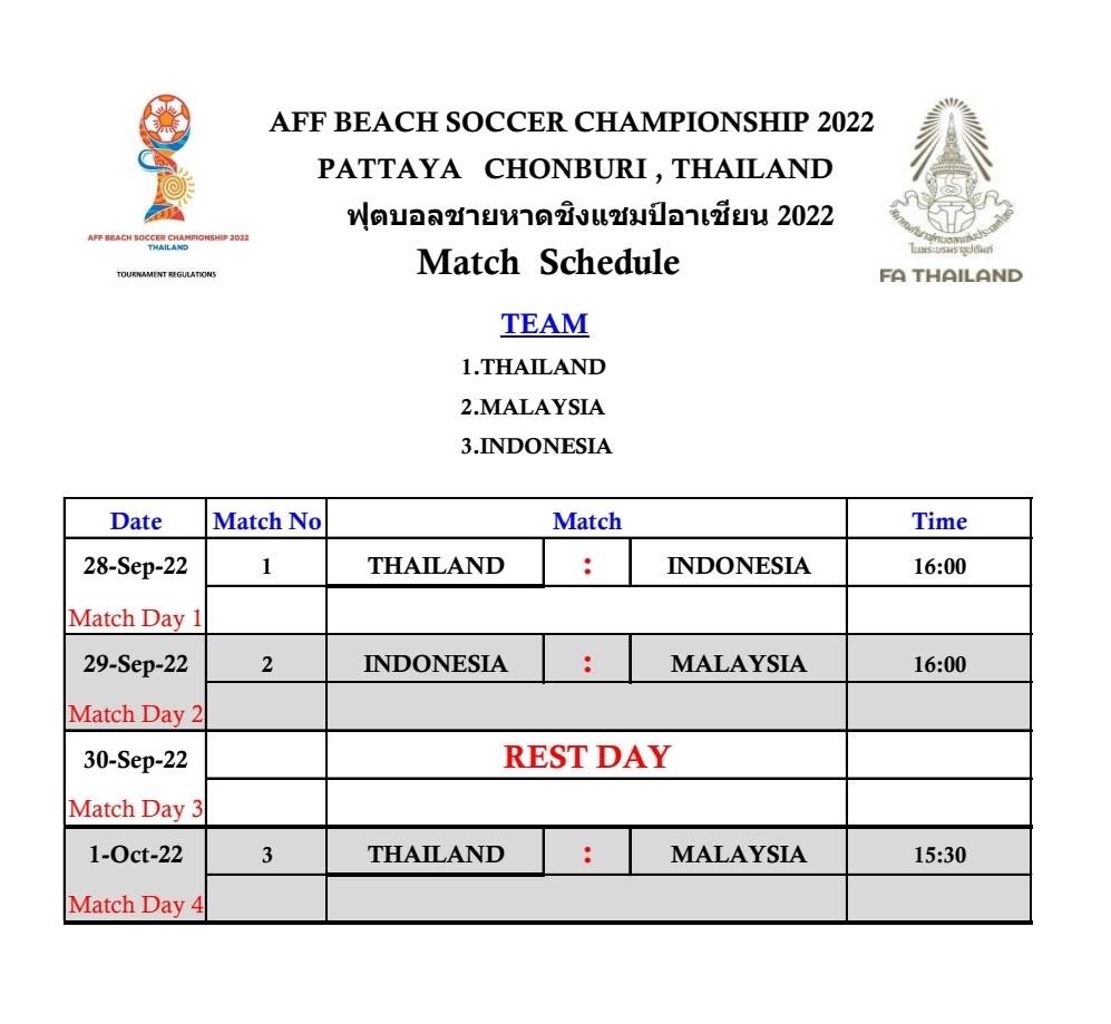ความเคลื่อนไหวทัพฟุตบอลชายหาดทีมชาติไทย ภายใต้การนำของ พลโทอิสระ วัชรประทีปที่ปรึกษาผู้ว่าการการกีฬาแห่งประเทศไทย ในฐานะผู้จัดการทีม และ “โค้ชเอก” เศรษฐกรชัย ชื่นตา หัวหน้าผู้ฝึกสอน ที่มีโปรแกรมการแข่งขันรายการชิงแชมป์อาเซียน “AFF BEACH SOCCER CHAMPIONSHIP 2022” ระหว่างวันวันที่ 28 กันยายน – 1 ตุลาคม 2565 ณ สนามพัทยากลาง จ.ชลบุรี ถ่ายทอดสดทาง TrueID