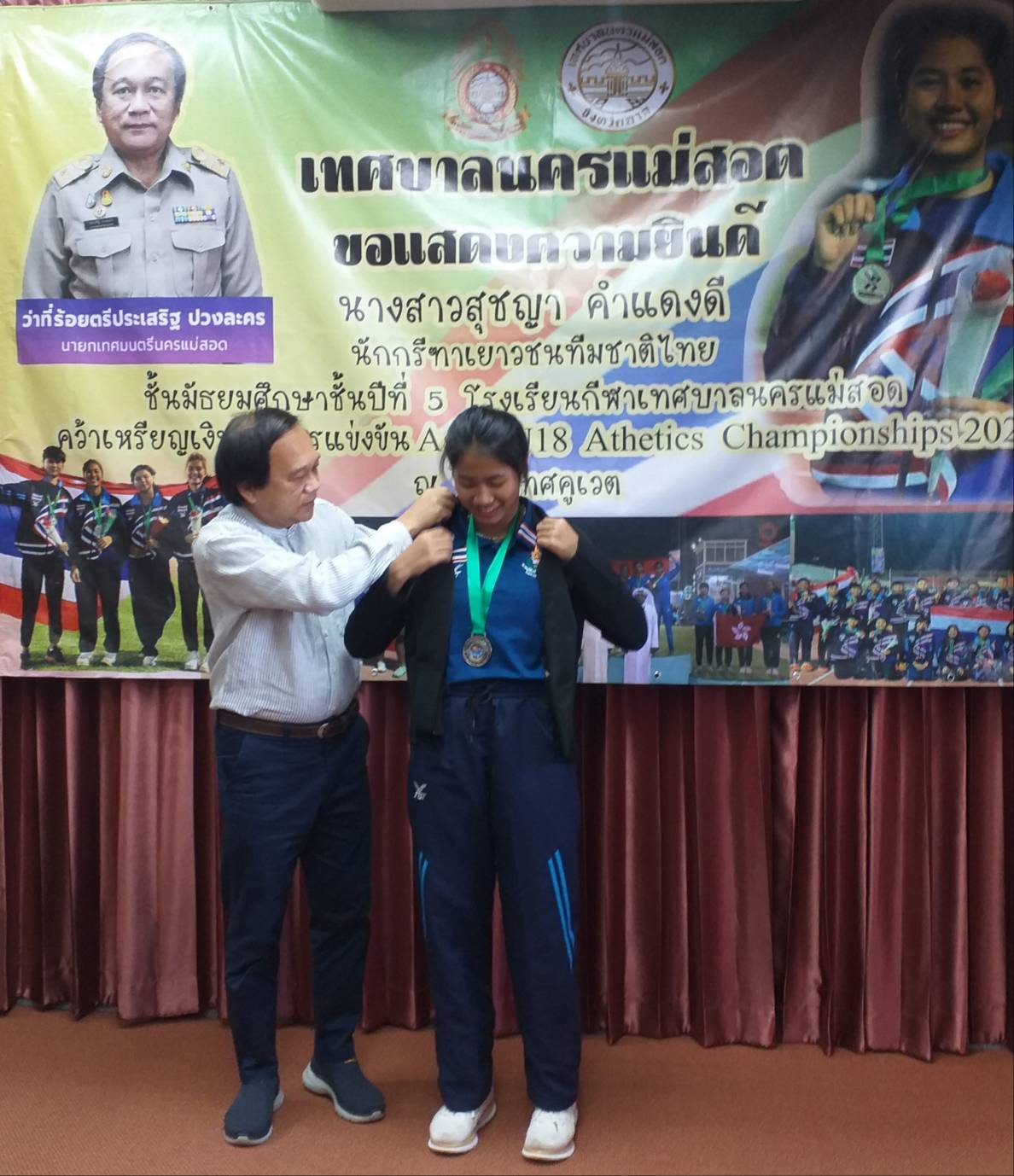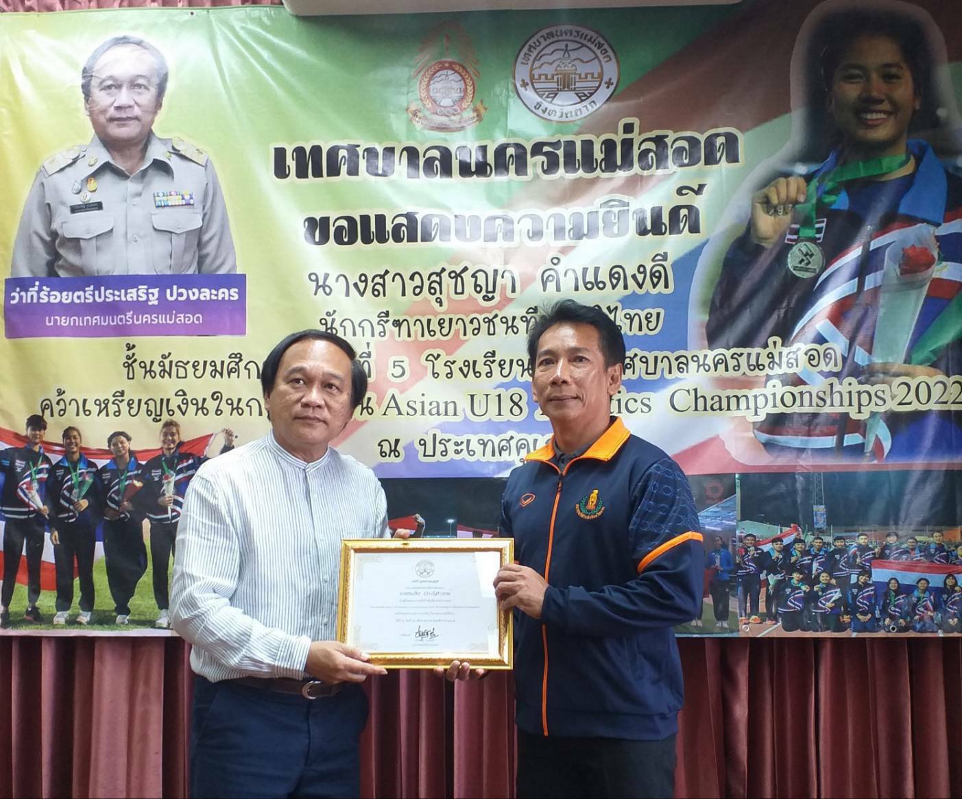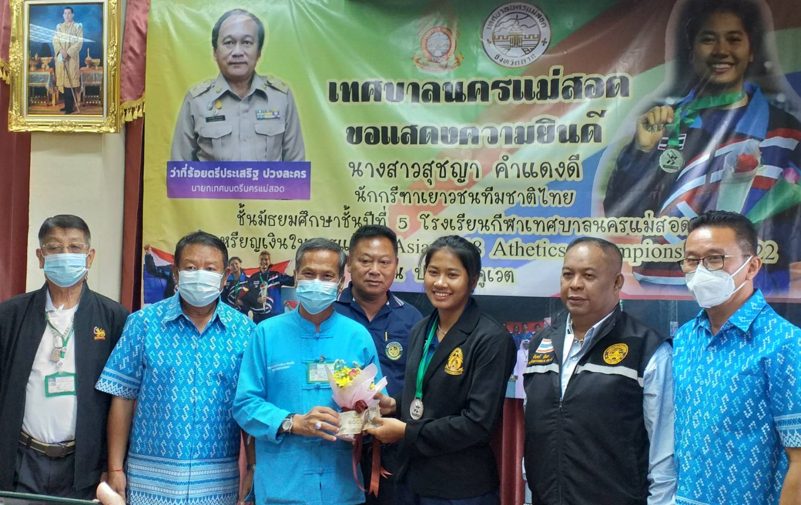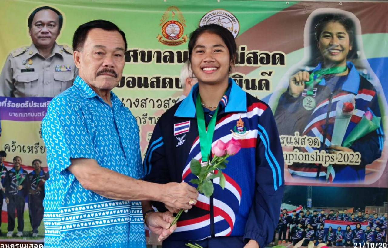 นายกเทศมนตรีนครแม่สอด จ.ตาก ร่วมแสดงความยินดีกับ น.ส.สุชญา คำแดงดี (น้องนุ่น) คว้าเหรียญเงิน ในการแข่งขัน Asian U 18 Athetics Championships 2022 ที่ประเทศคูเวต