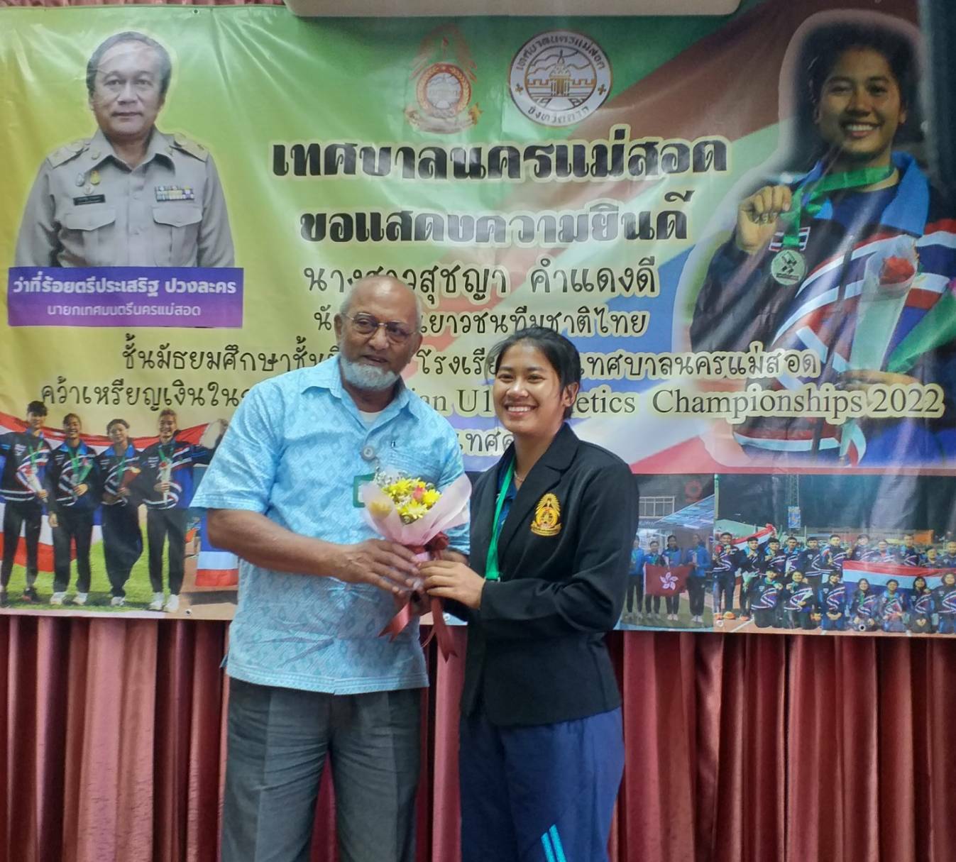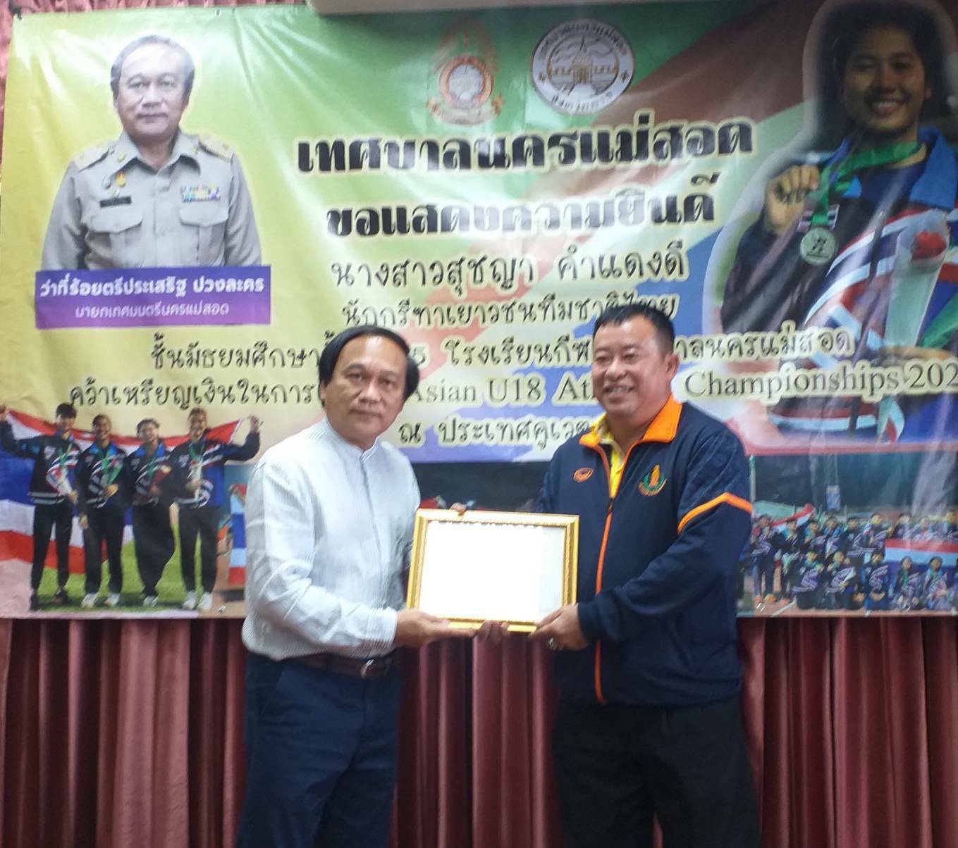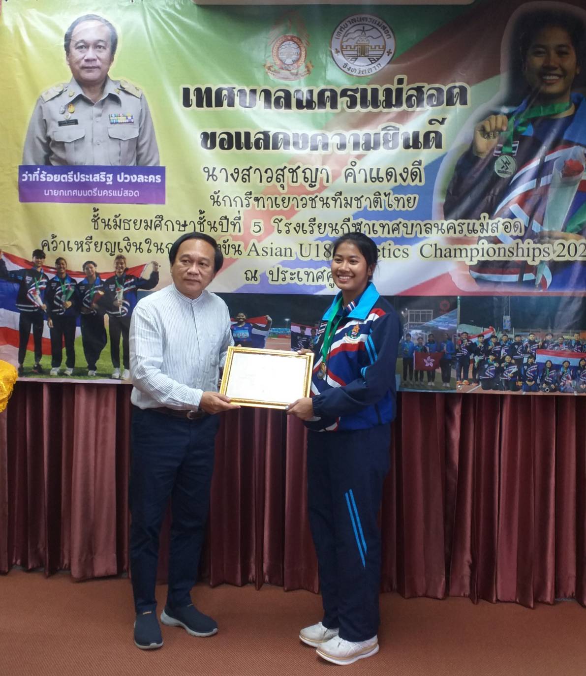 นายกเทศมนตรีนครแม่สอด จ.ตาก ร่วมแสดงความยินดีกับ น.ส.สุชญา คำแดงดี (น้องนุ่น) คว้าเหรียญเงิน ในการแข่งขัน Asian U 18 Athetics Championships 2022 ที่ประเทศคูเวต
