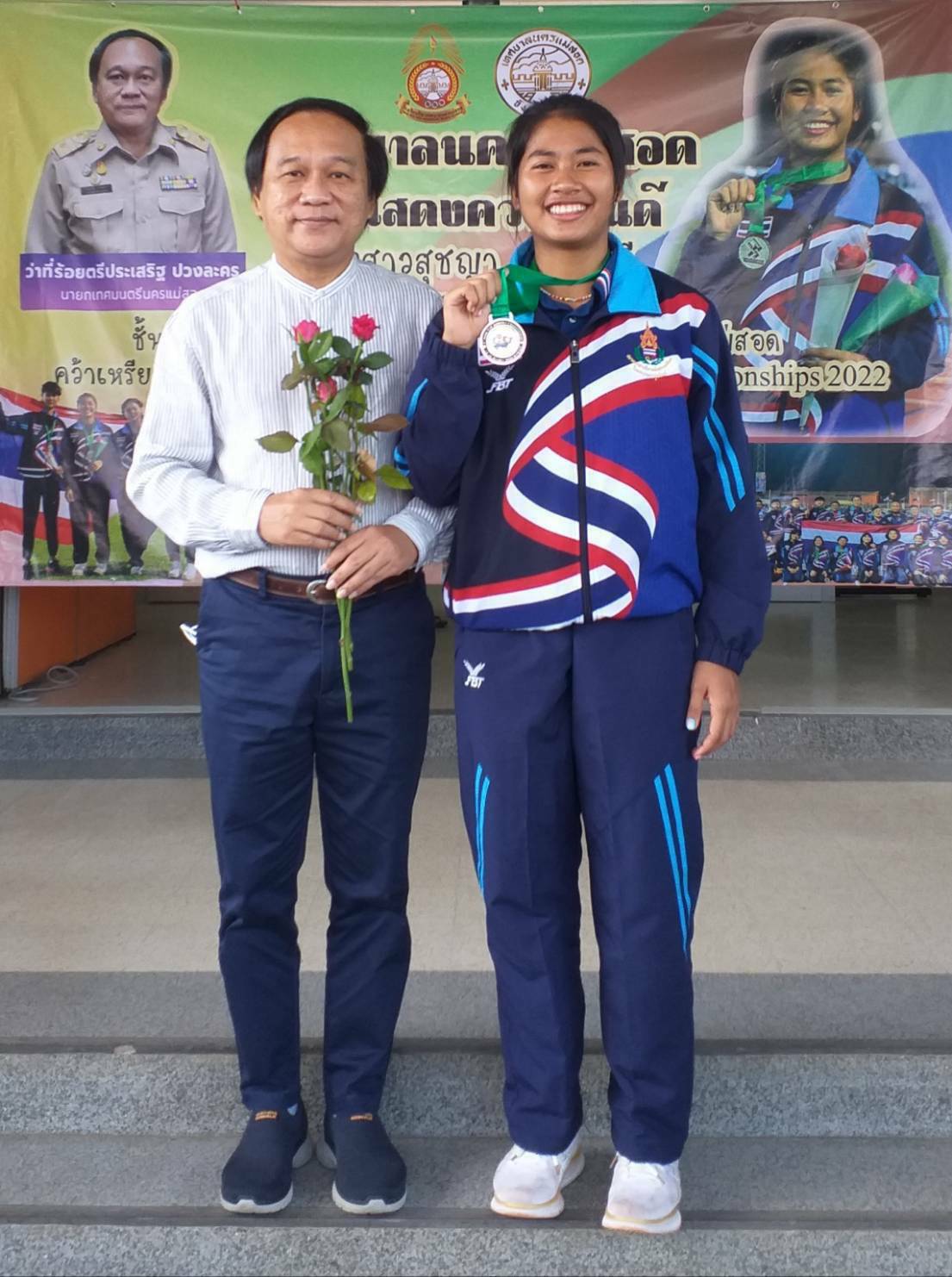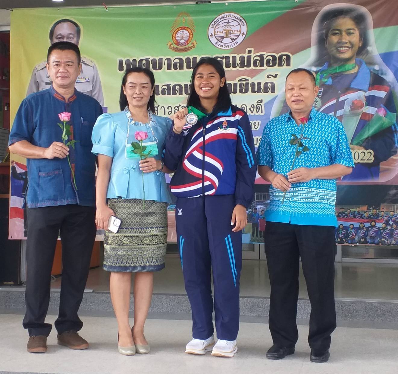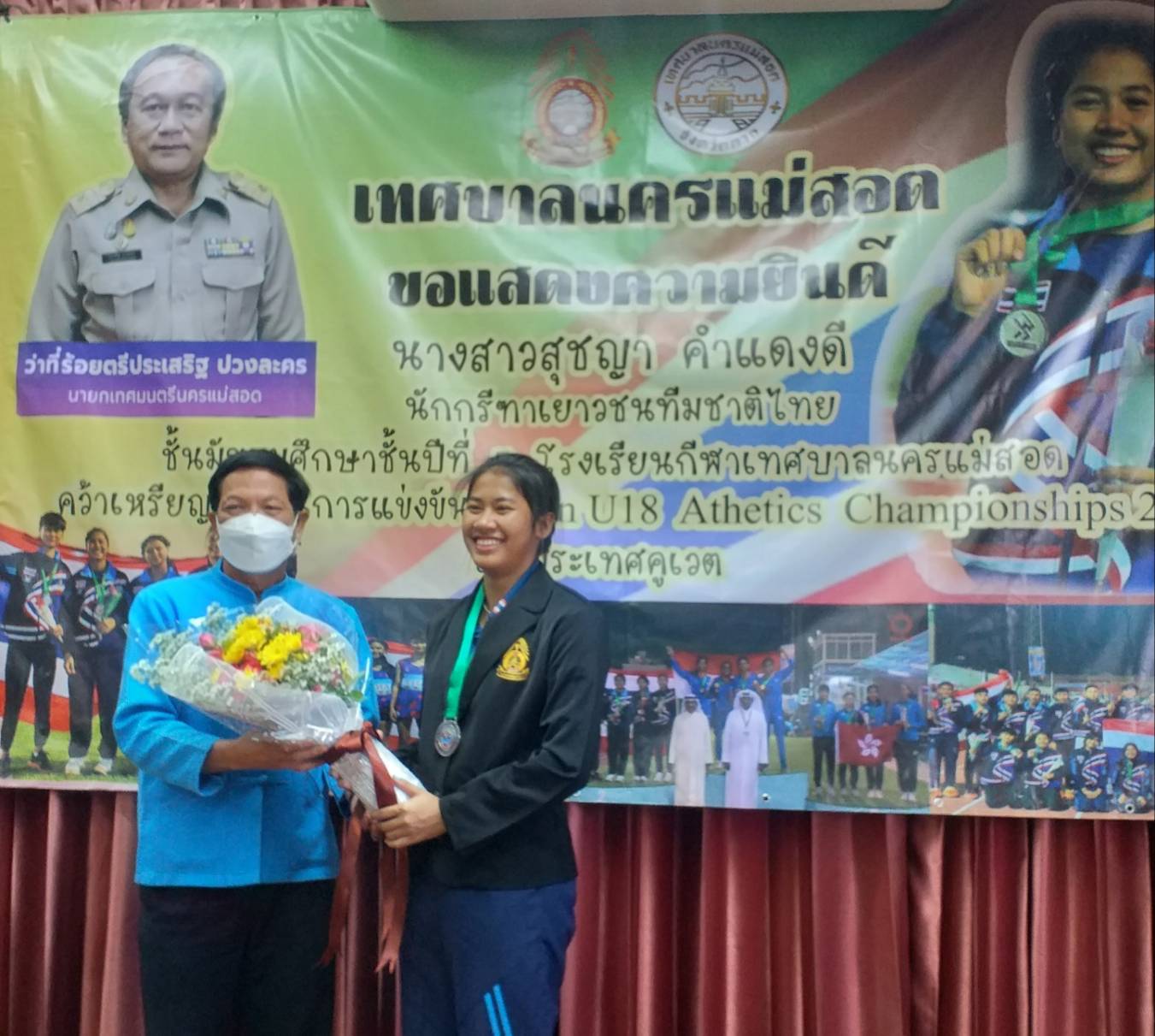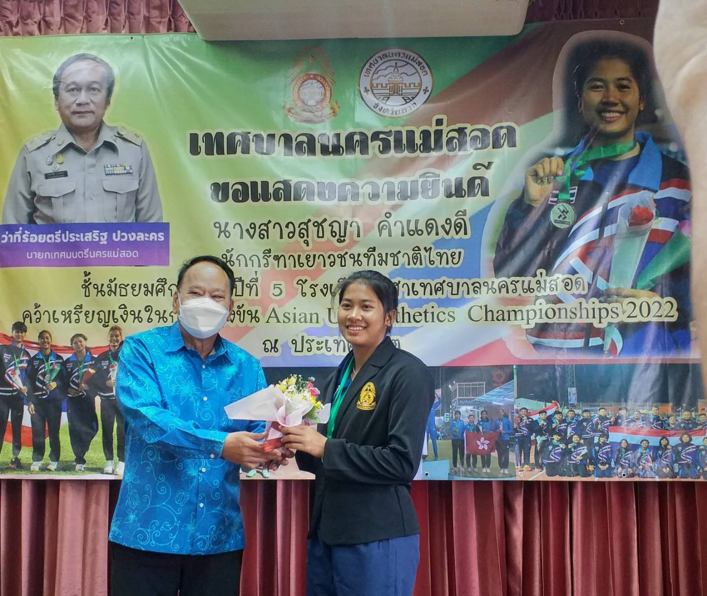 นายกเทศมนตรีนครแม่สอด จ.ตาก ร่วมแสดงความยินดีกับ น.ส.สุชญา คำแดงดี (น้องนุ่น) คว้าเหรียญเงิน ในการแข่งขัน Asian U 18 Athetics Championships 2022 ที่ประเทศคูเวต