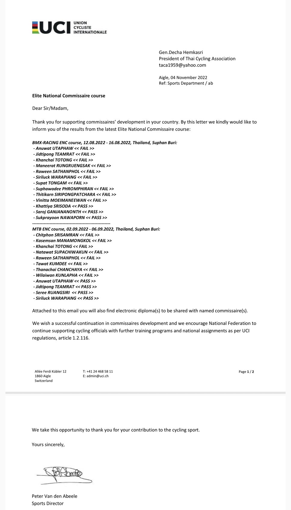 พลเอกเดชา กล่าวว่า ผลการอบรมทั้ง 2 หลักสูตรดังกล่าวปรากฏว่าผู้ตัดสินไทยผ่านสอบผ่านการอบรมทั้งภาคทฤษฎีและภาคปฏิบัติหลักสูตรบีเอ็มเอ็กซ์ จำนวน 3 คนประกอบด้วย นายสาโรจน์ กาญจนานนท์, นายขัตติยะ ศรีโสดา และนางสาวนวพร สุขประยูร ส่วนหลักสูตรเสือภูเขา ผู้ตัดสินไทยสอบผ่านภาคทฤษฎีและปฏิบัติ จำนวน 4 คน ประกอบด้วย นายอนุวัฒน์ อุตตะเภา, นางสาวศิริลักษณ์ วาระเพียง, จ่าเอก เสรี เรืองศิริ และ จ่าสิบเอก จิตติพงษ์ เทียมรัตน์ ส่งผลให้ไทยเรามีผู้ตัดสินระดับชาติขั้นสูงประเภทเสือภูเขาเพิ่มขึ้นเป็น 10 คน จากเดิมที่มี นายสาโรจน์ กาญจนานนท์, พันตรีหญิง จันทร์เพ็ง นนทะสิน, นางสาวนวพร สุขประยูร, นางสาวศศิมา อารี, นายขัตติยะ ศรีโสดา และ นางสาวธิติกาญจน์ ศิริพงศ์พัชร ที่สอบผ่านมาแล้วก่อนหน้านี้